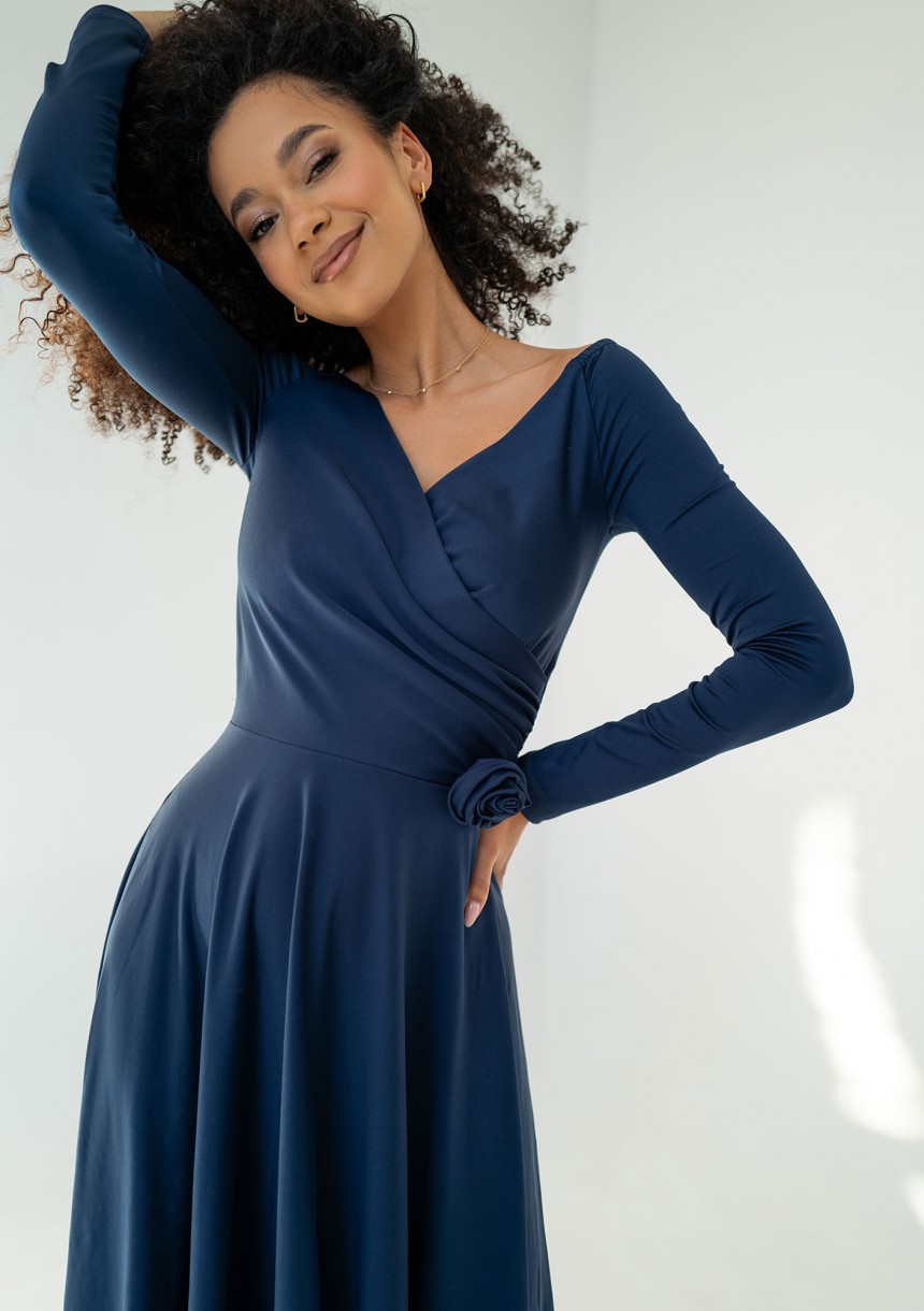 Modna sukienka z różyczką, wykonana z pięknie lejącej się tkaniny w kolorze granatowym. Rozkloszowana kreacja zadaje szyku cudnym dekoltem kopertowym, który eksponuje wdzięki górnych partii sylwetki. Subtelnie podkreśli Twój elegancki wizerunek i sprawdzi się doskonale przy świątecznych i uroczystych okazjach! Jako ponadczasowy model, może być Twoim corocznym kołem ratunkowym i stanowić sukienkę na święta, uroczystość rodzinną, wesele.