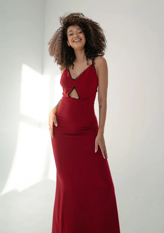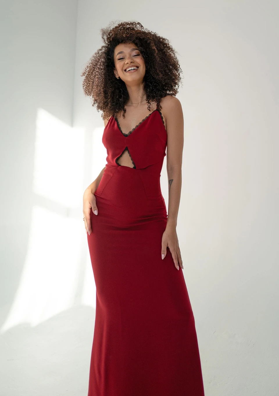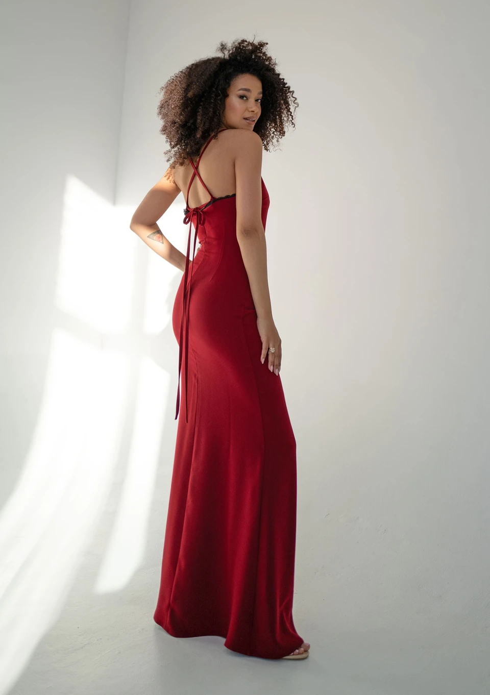 Zmysłowa sukienka wieczorowa maxi na ramiączkach w bordowym kolorze, o kształcie syreny. Kreacja z dekoltem subtelnie obszytym koronką i wycięciem na talii.