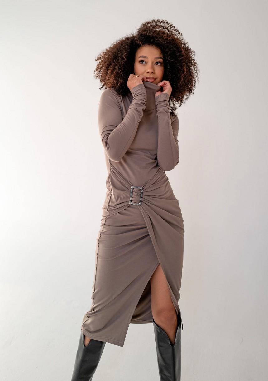 Modna sukienka z długim rękawem i golfem. Wygodna, dopasowuje się do sylwetki, a przy tym ma przyjemnie miękki materiał wiskozowy. Sukienkę zdobi delikatna draperia udekorowana prostokątną, szylkretową klamrą. Codzienna kreacja posiada kopertowy dół, który subtelnie eksponuje nogi. Bardzo łatwo ją wystylizujesz w chłodne dni, pasuje do dowolnych botków, kozaków jak i eleganckich obcasów. Miya to bardzo wszechstronna sukienka dla minimalistek, sprawdzi się zarówno na co dzień, jako sukienka do pracy i popołudniową kawę.