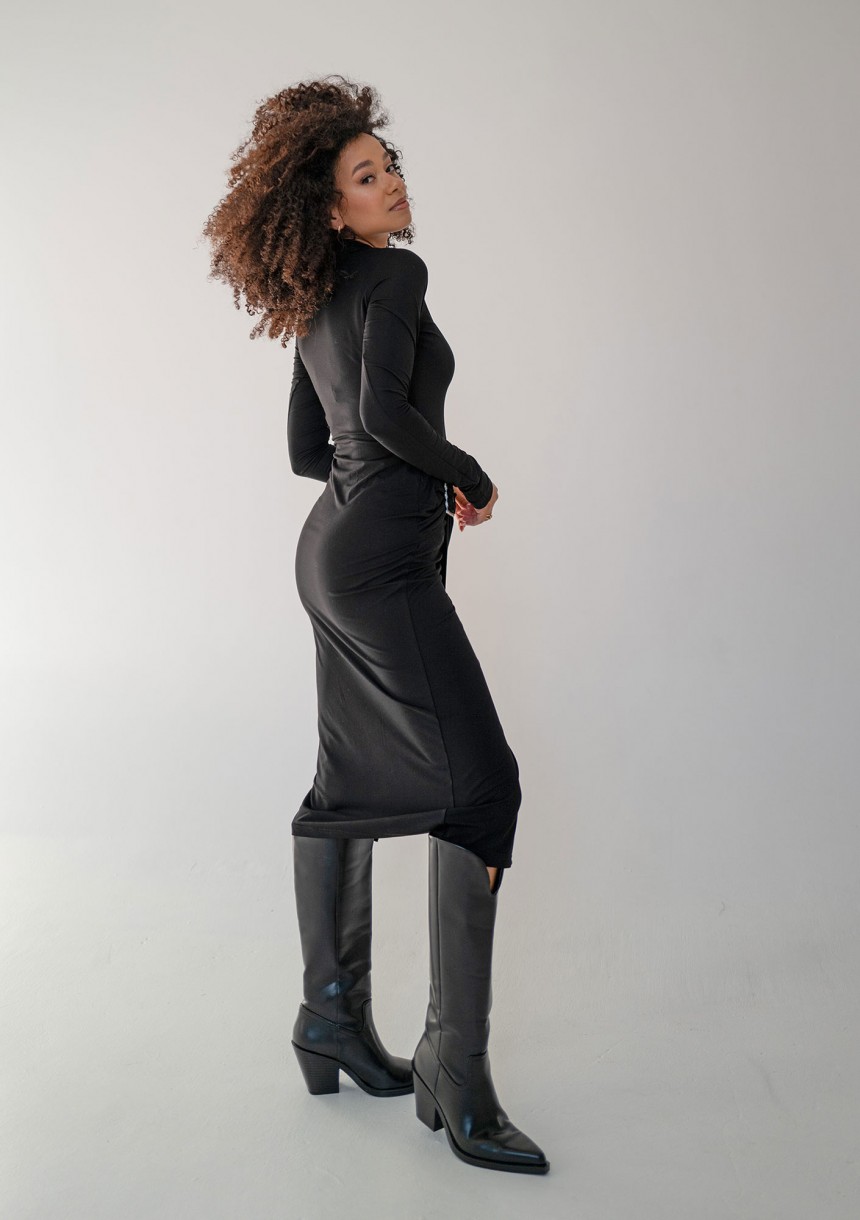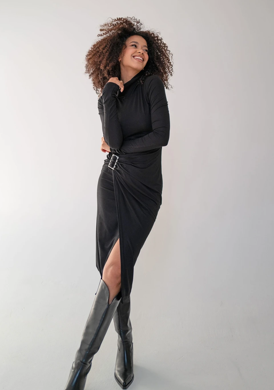 Modnie drapowana sukienka z wiskozy w czarnym kolorze. Z delikatnym golfem, długim rękawem, wykonana z wygodnie elastycznego materiału.
