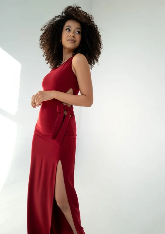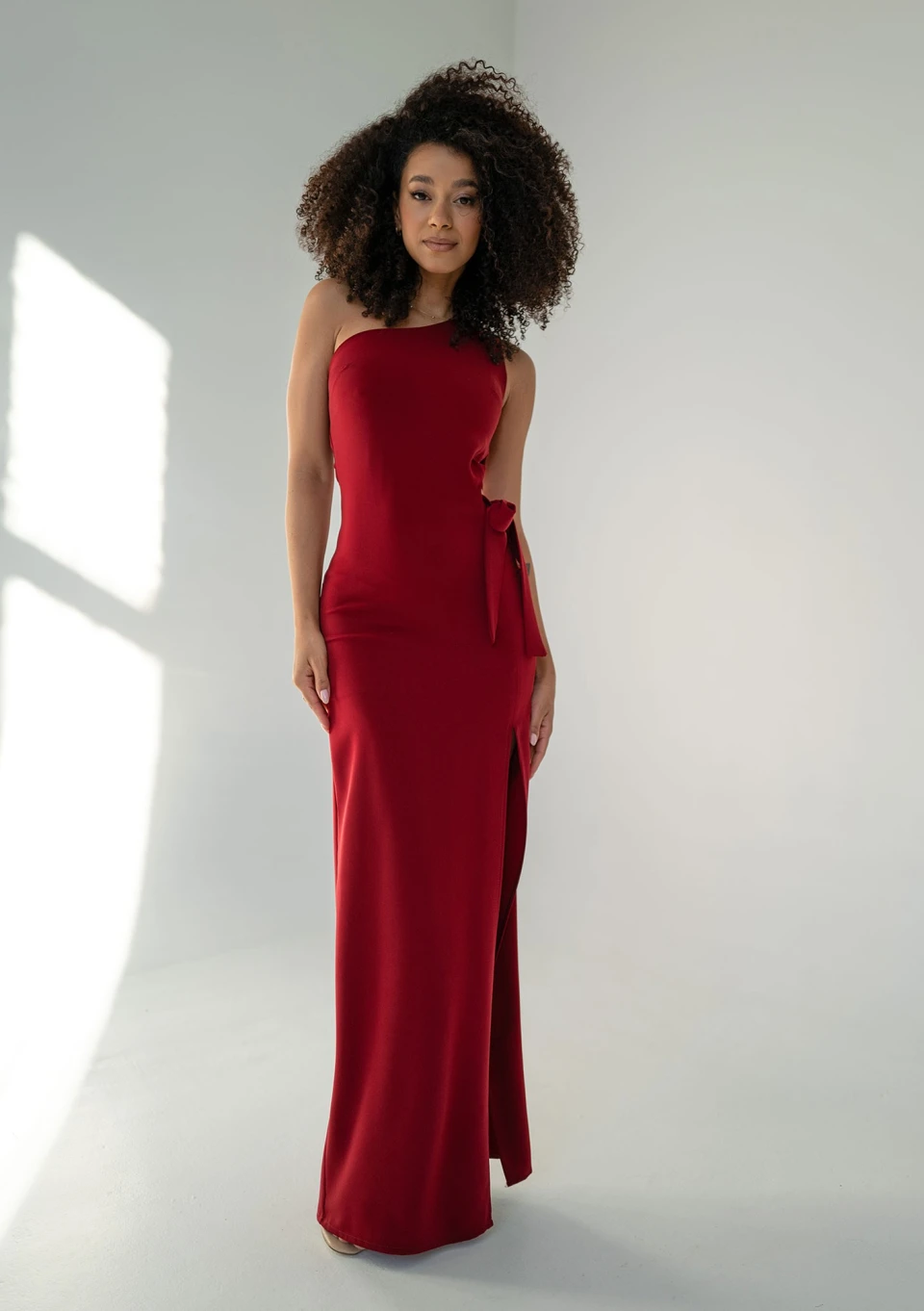 Długa sukienka na sylwestra, studniówkę, wesele. Zmysłowo okalająca sylwetkę, udekorowana kokardką i wycięciem na talii. Kreacja w kolorze bordo z efektownym dekoltem na jedno ramię.