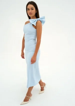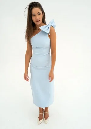 Elegancka, błękitna sukienka midi z jednym ramieniem, ozdobiona przepiękną kokardą, to kwintesencja nowoczesnego szyku. Delikatnie zarysowuje sylwetkę, podkreślając kobiece linie. Dekolt na jedno ramię to wyrafinowany akcent, który przyciąga uwagę i wprowadza interesującą asymetrię, a kokarda natychmiast nadaje jej wyjątkowego wyrazu, wprost stworzonego do świętowania ważnych momentów. Evia to idealna błękitna sukienka wieczorowa na wiosnę i lato, doskonała na każde przyjęcie czy oficjalne wydarzenie, w tym na wesele. Kreacja wykonana w tym jasnym kolorze idealnie wpisuje się w atmosferę imprez sezonu. Sprawdzi się jako sukienka na chrzciny, sukienka na komunię, a także wszelkie inne uroczystości rodzinne, jak i przyjęcia koktajlowe.