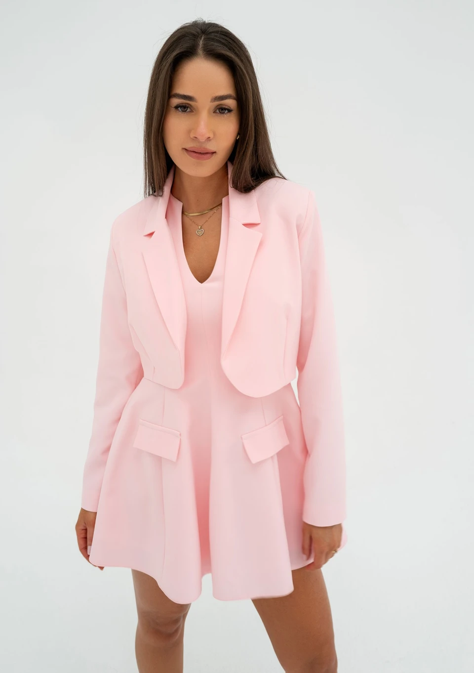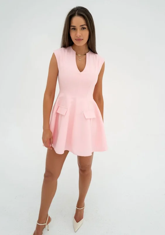 Elegancka sukienka o rozkloszowanym kroju. Kreacja w delikatnym, pudrowym odcieniu, który subtelnie podkreśli Twoją urodę. Długość mini kokieteryjnie eksponuje nogi.