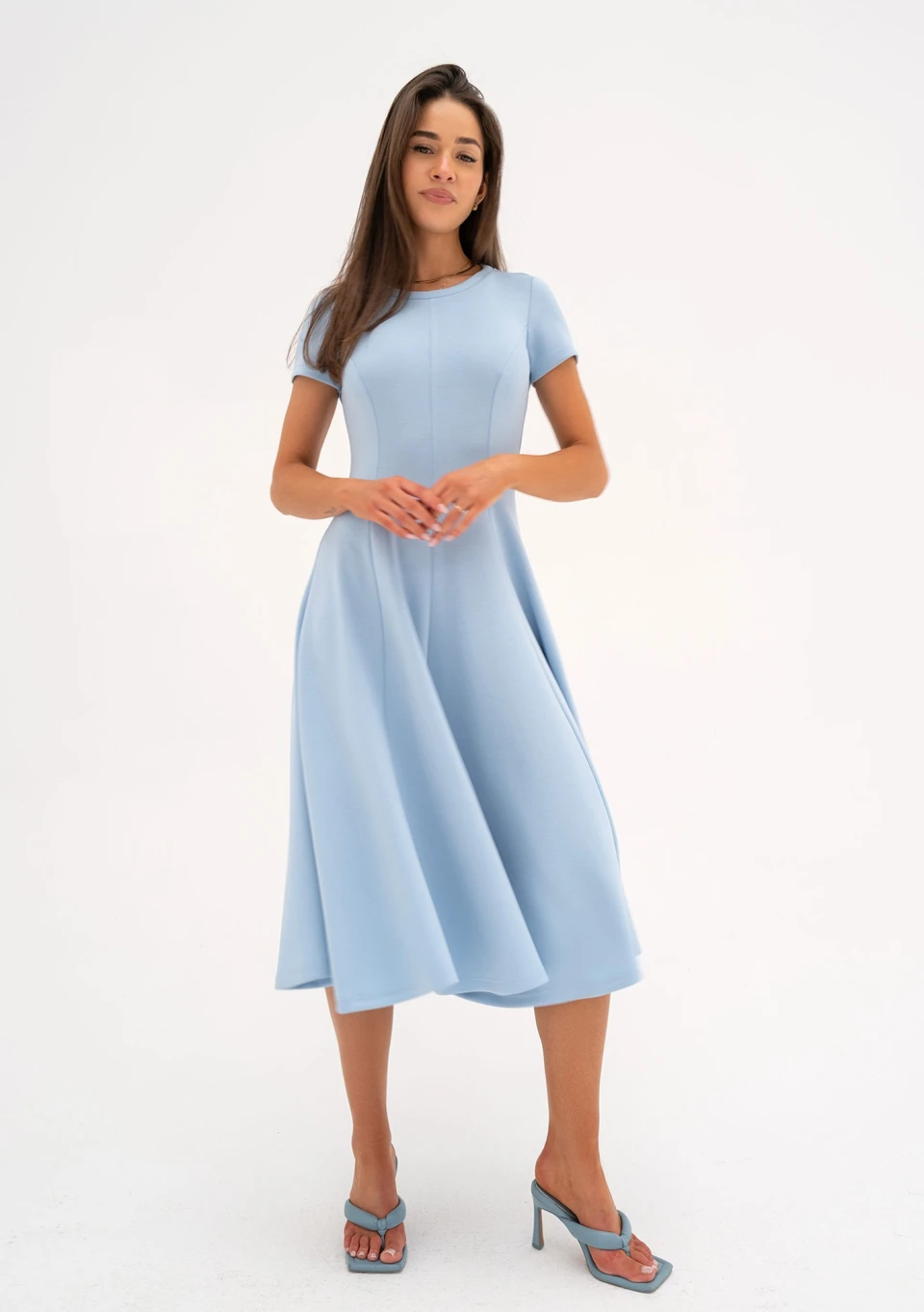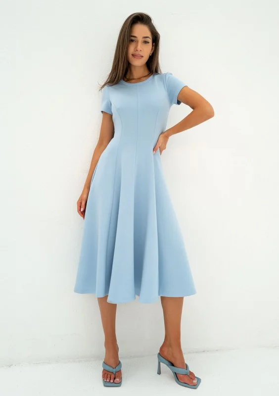 Subtelna, rozkloszowana sukienka midi w błękitnym kolorze. Kreacja z krótkim rękawem, z materiału z wiskozą.