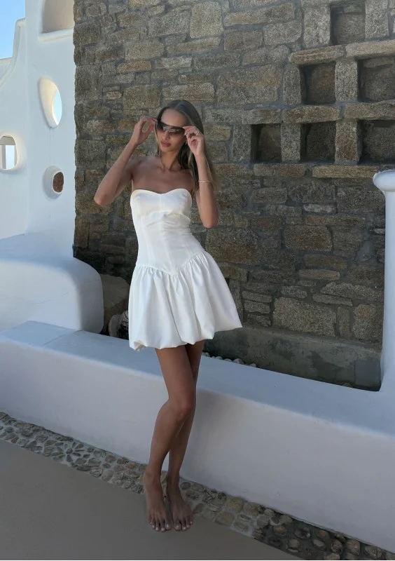Wyjątkowa sukienka mini o modnej formie bombki z gorsetowym dekoltem. Wykonana w białym kolorze, idealna na romantyczne spotkania, imprezy i uroczystości.