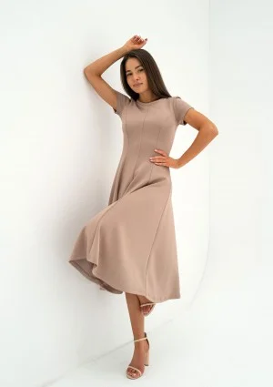 Beżowa sukienka midi o rozkloszowanym kroju to esencja subtelnej elegancji i uniwersalności. Jej prosty fason bez zbędnych ozdób, z krótkimi rękawkami, czyni ją ponadczasową bazą wielu stylizacji. Gładki i wszechstronny odcień beżu latte sprawia, że pasuje na każde wyjście, a rozkloszowany dół zapewnia swobodę ruchów i podkreśla talię, tworząc klasyczną, kobiecą sylwetkę. Idealna na spacer, kawę z przyjaciółką czy inne spotkanie. Wystarczy dobrać do niej wygodne baleriny, mokasyny lub espadryle i małą torebkę listonoszkę. Możesz dodać jeansową kurtkę lub lekki kardigan w chłodniejsze dni. W zależności od dobranych dodatków, Jasmen sprawdzi się na urodzinach, jako sukienka na chrzciny, komunię czy nawet mniej formalne wesele.
