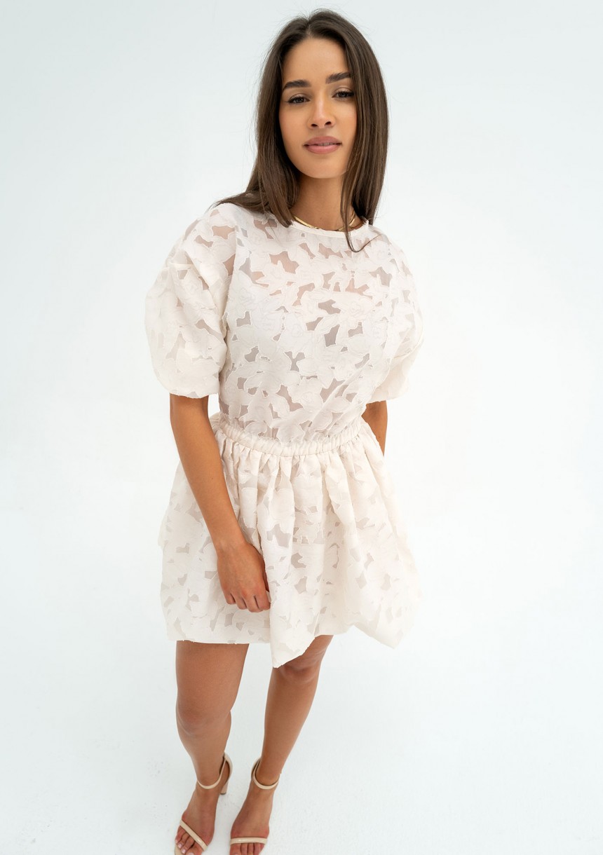 Delikatna sukienka ażurowa w kwiaty, wykonana w całości z bawełny. Pełna uroku i romantyzmu, w modnej formie bombki z krótkim rękawem.