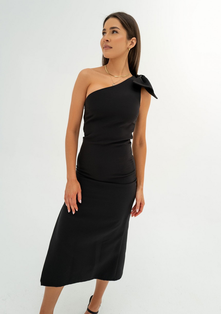 Elegancka, czarna sukienka z kunsztowną kokardą na ramieniu i dekoltem na jedno ramię. Cudowna, wszechstronna i subtelnie podkreślająca sylwetkę.