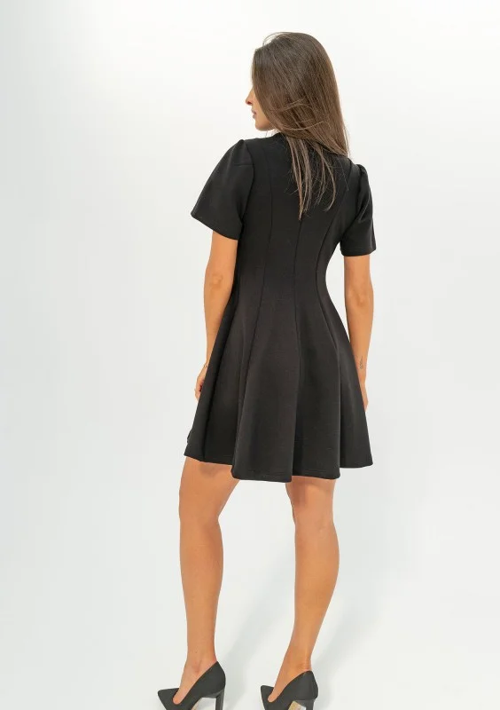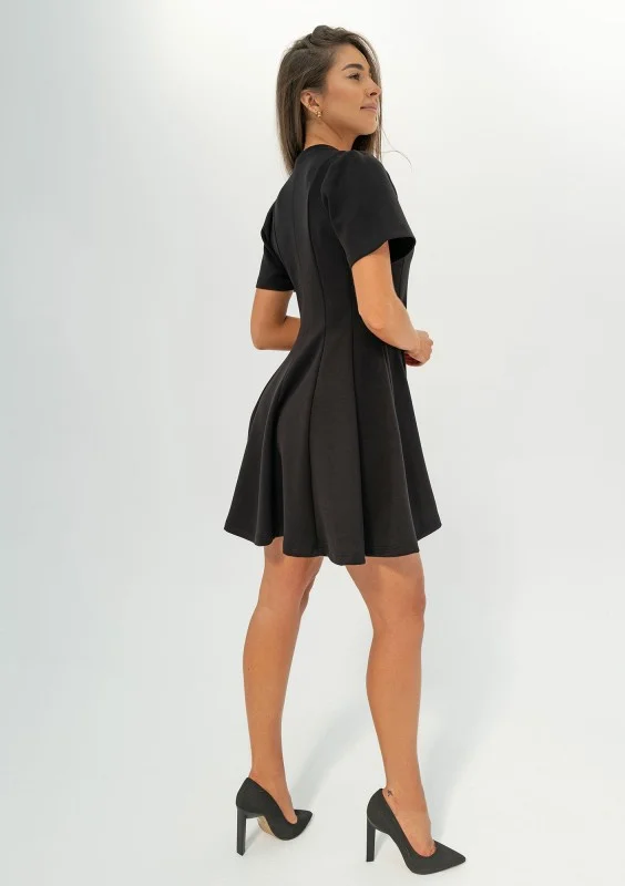 Czarna sukienka mini w eleganckiej, rozkloszowanej formie z krótkim rękawem. Kreacja niezwykle wszechstronna i ponadczasowa, wykonana z komfortowego materiału z wiskozą.
