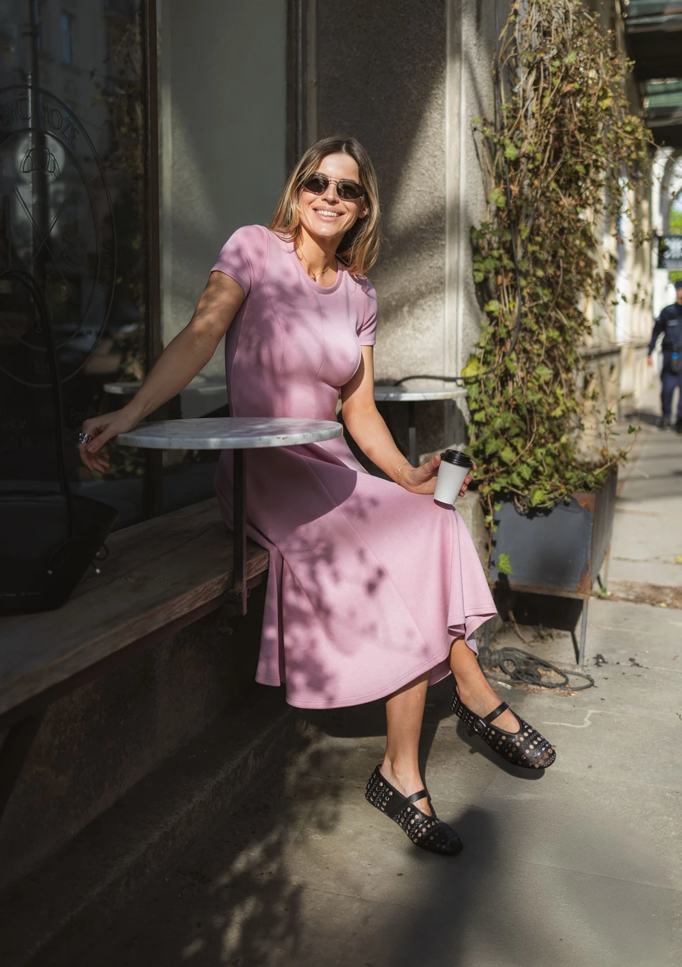 Pudrowa sukienka midi o rozkloszowanym kroju to esencja subtelnej elegancji i uniwersalności. Jej prosty fason bez zbędnych ozdób, z krótkimi rękawkami, czyni ją ponadczasową bazą wielu stylizacji. Delikatny odcień pudrowego różu dodaje jej dziewczęcego uroku, a rozkloszowany dół zapewnia swobodę ruchów i podkreśla talię, tworząc klasyczną, kobiecą sylwetkę. Idealna na spacer, kawę z przyjaciółką czy niezobowiązujące spotkanie. Wystarczy dobrać do niej wygodne baleriny, białe trampki lub espadryle i małą torebkę listonoszkę. Możesz dodać jeansową kurtkę lub lekki kardigan w chłodniejsze dni. W zależności od dobranych dodatków, Jasmen sprawdzi się na urodzinach, jako sukienka na chrzciny, komunię czy nawet mniej formalne wesele.