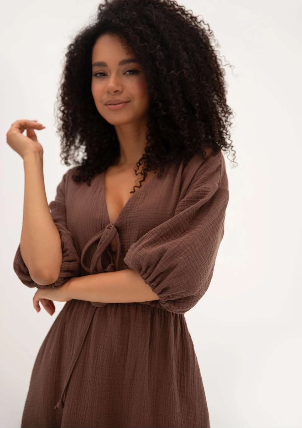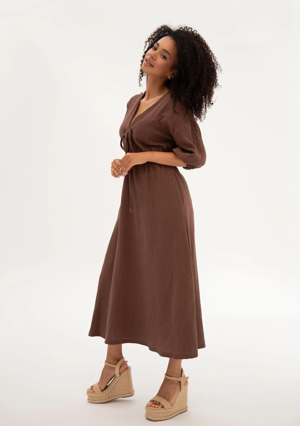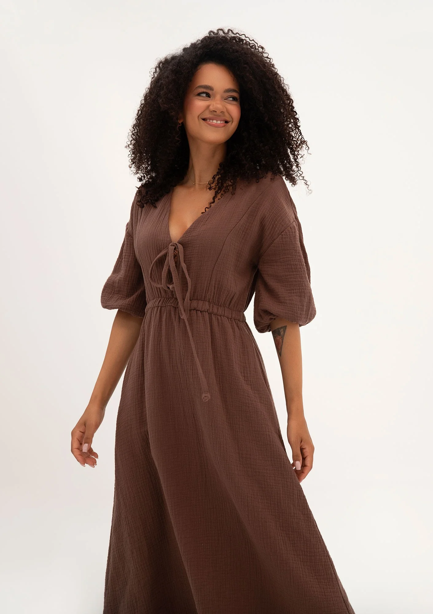 Liliane - Muślinowa sukienka midi z wiązaniem Brown