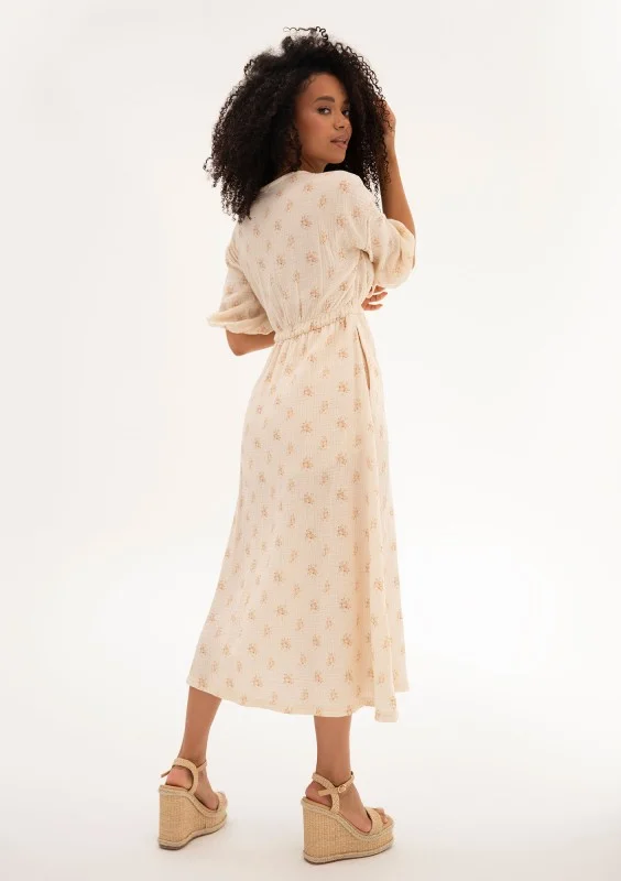 Wyjątkowa sukienka midi o vintage'owym wzorze kwiatków, który wprowadza niezwykle sielski, romantyczny klimat. W pełni naturalna, z bawełnianego muślinu.