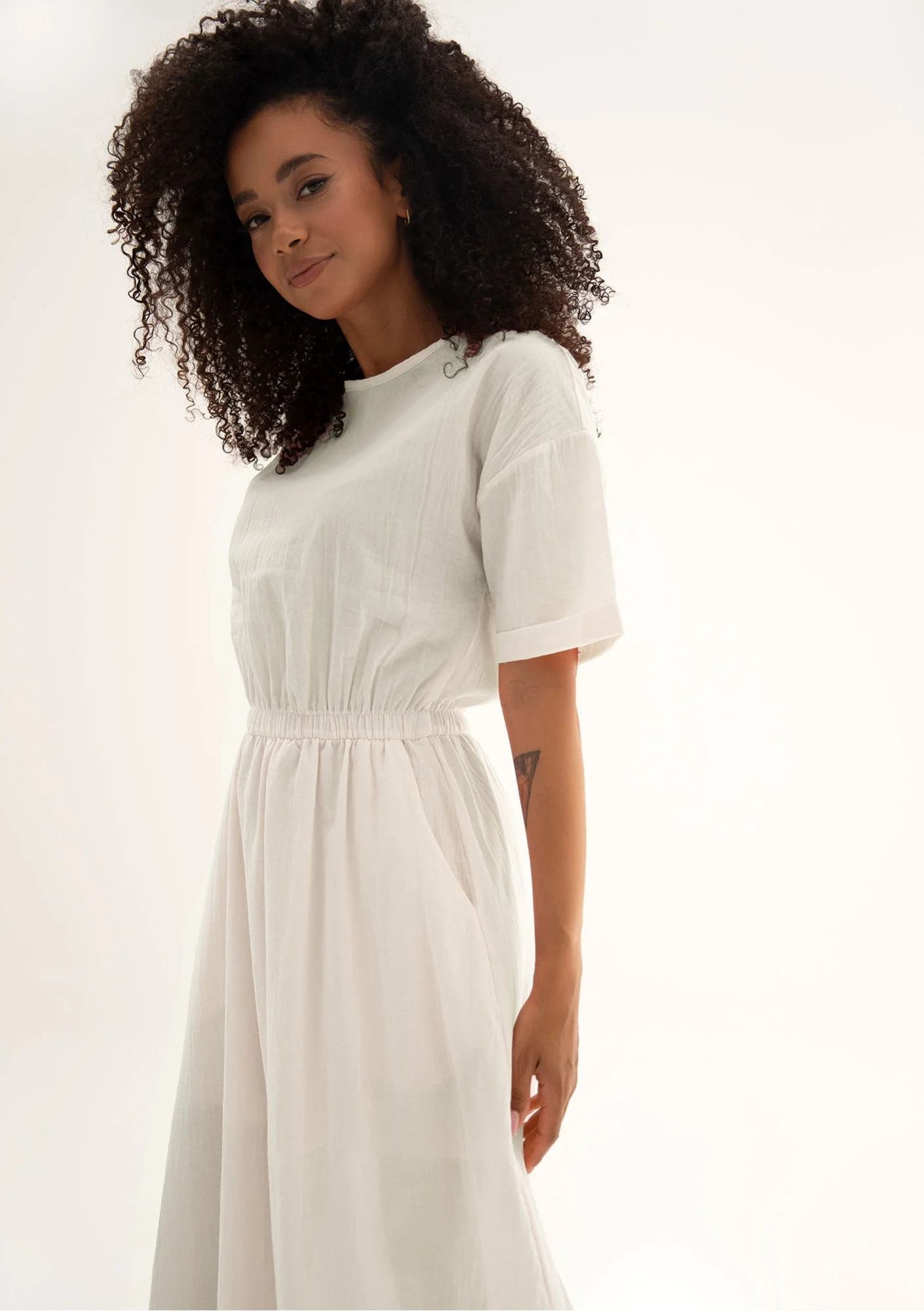 Prezentowana sukienka maxi Eveil w odcieniu bieli - kości słoniowej to kwintesencja letniego komfortu! Stworzona z myślą o współczesnej kobiecie, która ceni sobie swobodę i ponadczasowy styl, idealnie sprawdzi się zarówno podczas wakacyjnego spaceru po plaży, jak i podczas niezobowiązującego spotkania na letnim lunchu. Jej zwiewny fason doskonale koresponduje z naturalną bawełną. Co więcej, praktyczne kieszenie stanowią niezwykły atut, umożliwiając wygodne przechowywanie drobiazgów zawsze pod ręką.