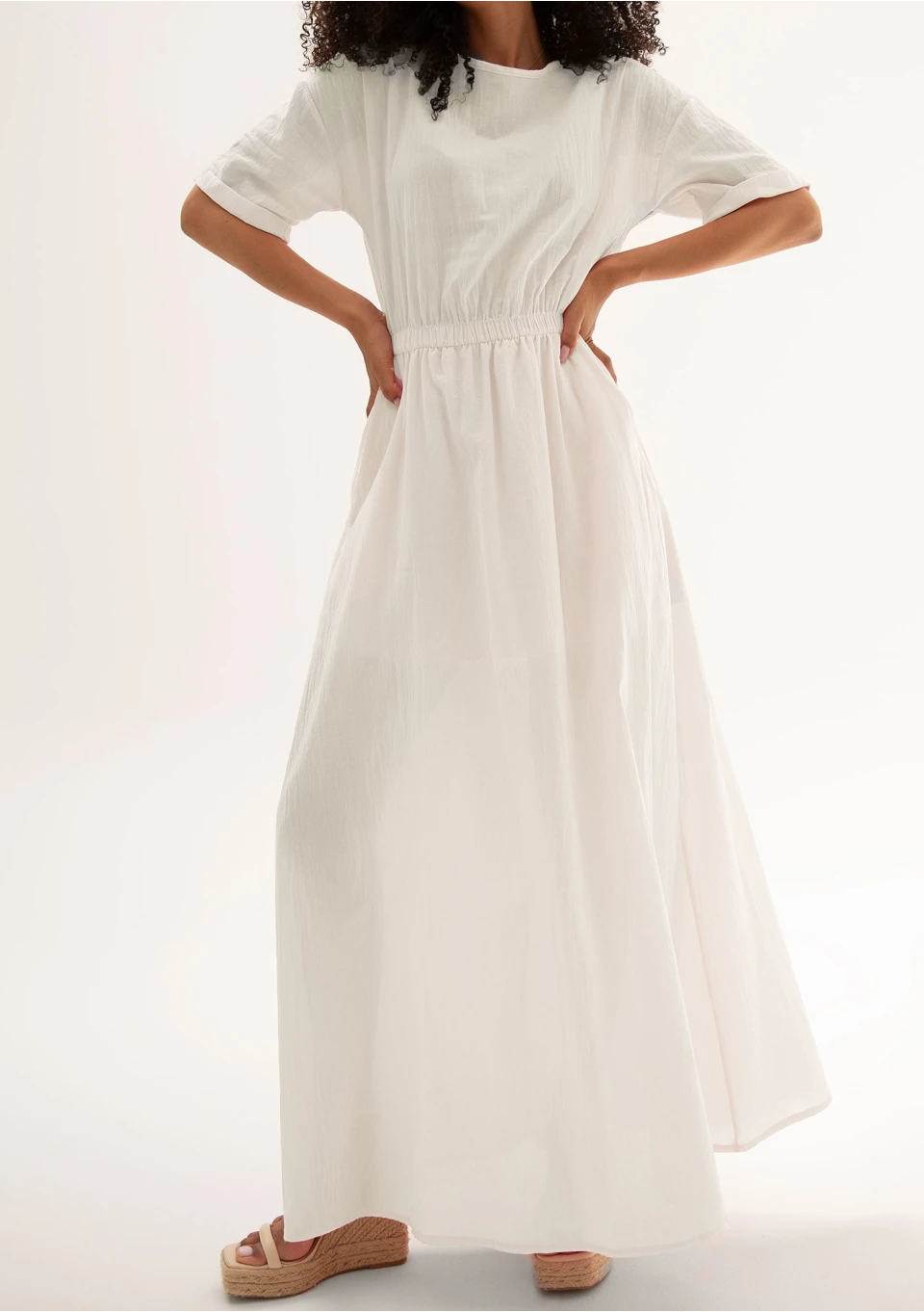 Zwiewna sukienka letnia o długość maxi, w pełni naturalna, z tkaniny bawełnianej bez domieszek. W odcieniu kości słoniowej.