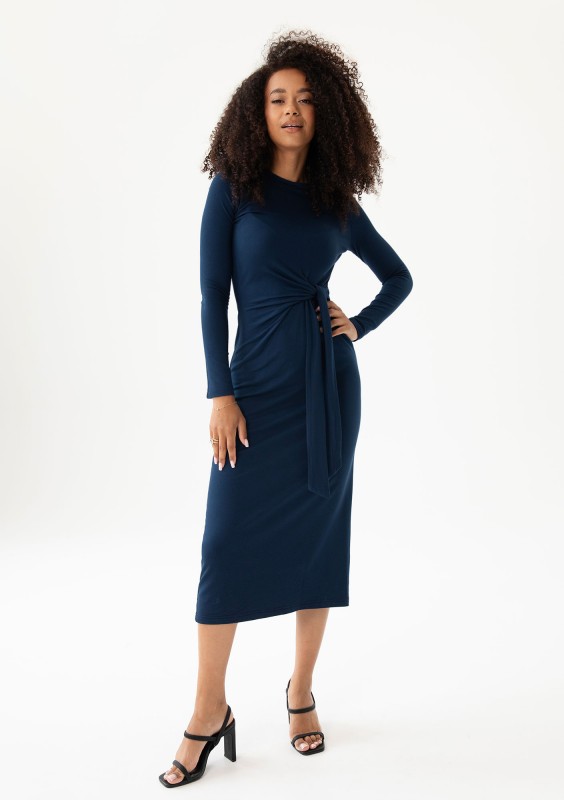 Elegancka sukienka w granatowym kolorze z długim rękawem. Kreacja z wiązaniem na boku, które sprytnie modeluje talię. Sukienka z wiskozy.