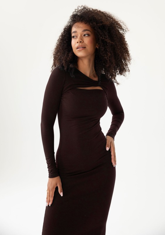 Brązowa sukienka z długim rękawem, wykonana z miękkiej wiskozy. Prosty design został uszlachetniony efektownym wycięciem na dekolcie.
