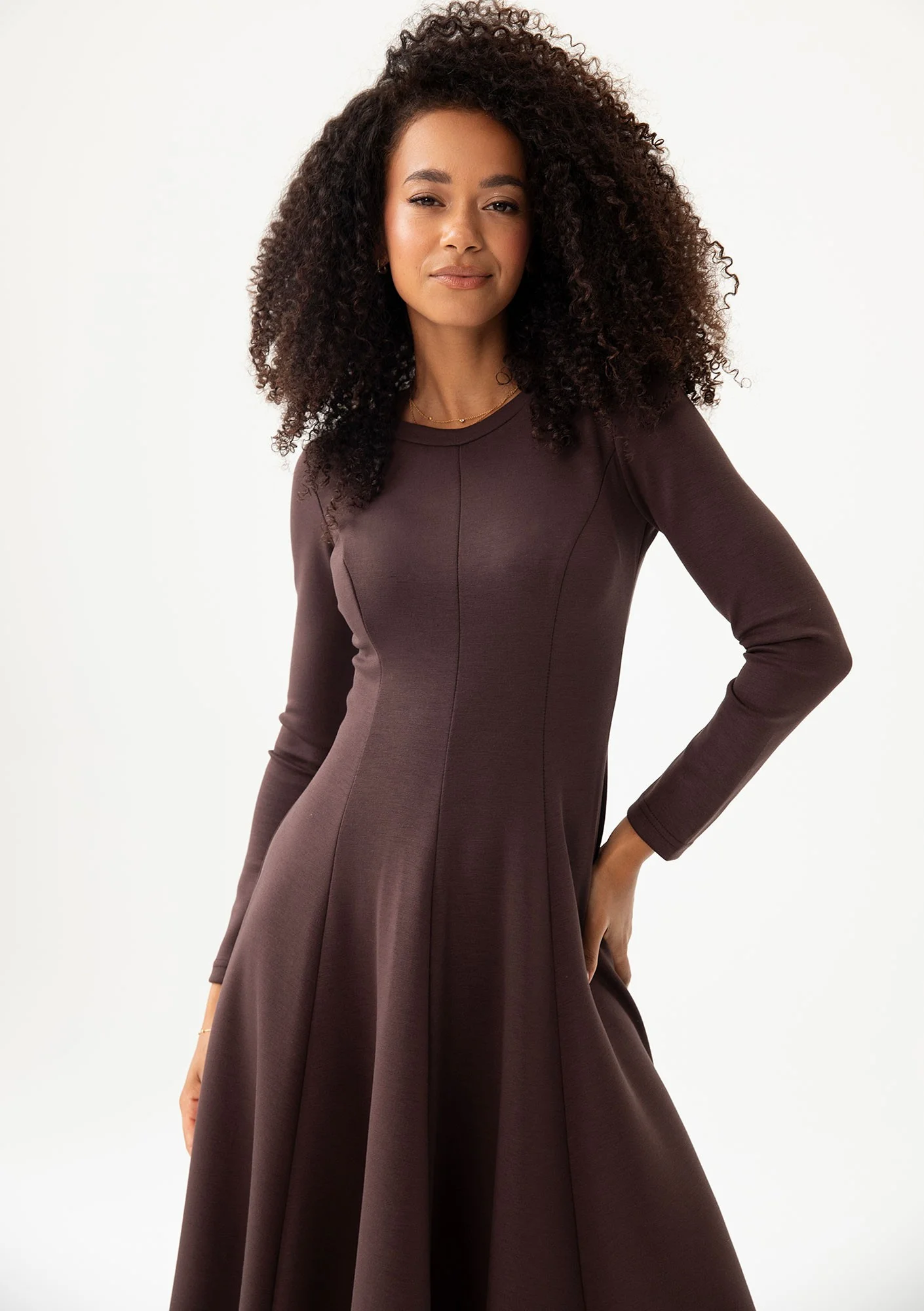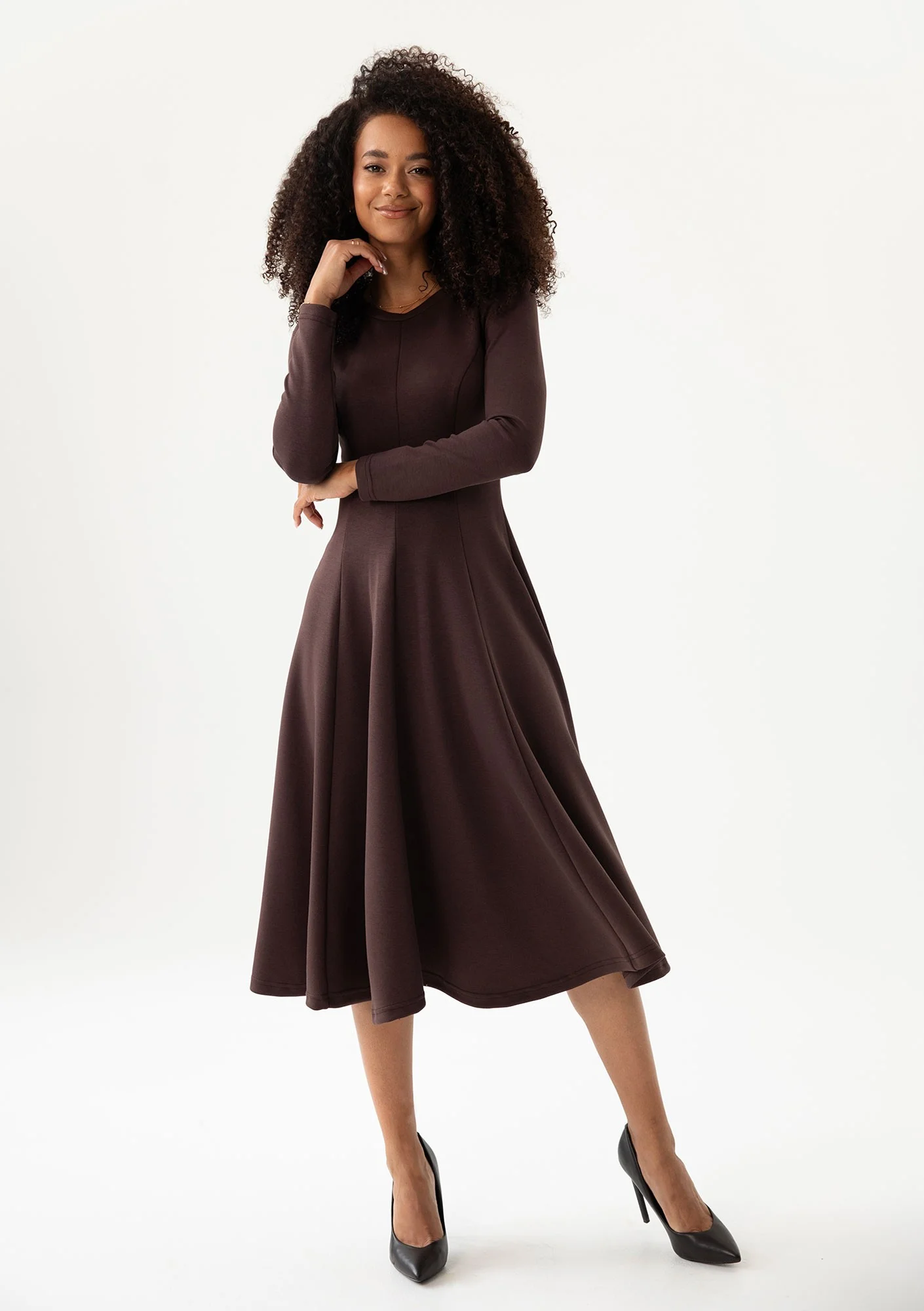 Grace - Rozkloszowana sukienka midi z modelującymi przeszyciami Brązowa