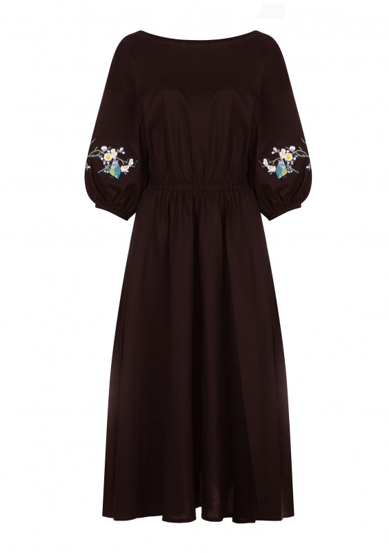 Brązowa sukienka bawełniana, urokliwie zdobiona haftami na rękawach. Wszechstronna kreacja midi na każdą okazję.