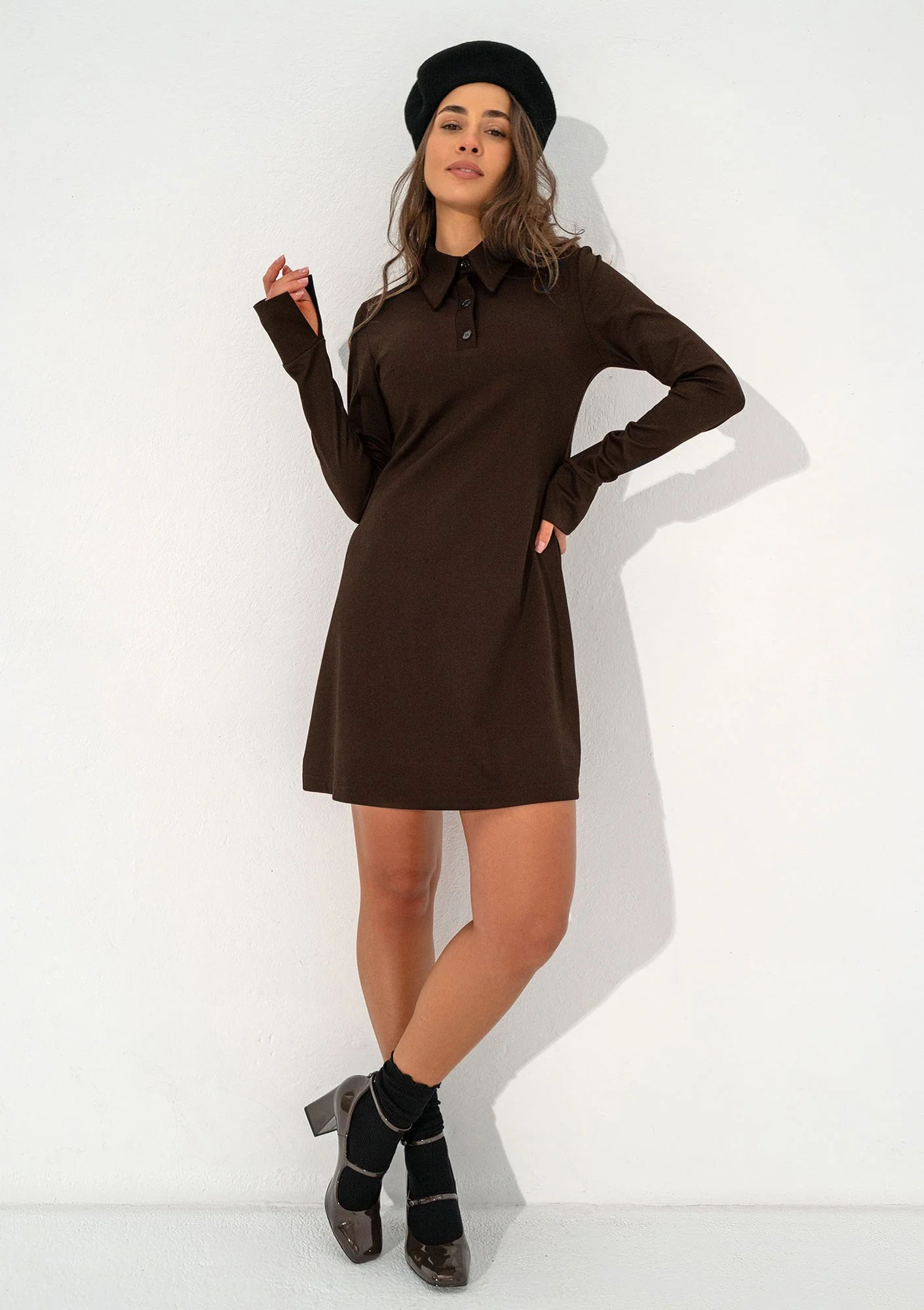 Niech trapezowa sukienka mini w stylu polo z długim rękawem stanie się Twoją nową definicją jesiennego komfortu i stylu! Ten uroczy krój pięknie modeluje sylwetkę, zachowując jednocześnie swobodę, a klasyczny kołnierzyk dodaje jej sportowej, a zarazem eleganckiej nuty. Niewielkie brązowe sukienki świetnie wyglądają w stylizacjach typu "preppy" lub "casual chic": połącz ją z kryjącymi rajstopami, modnymi botkami lub cięższymi workerami i narzuć wełniany beret, by uzyskać nonszalancki paryski look idealny na weekendowe spotkania, wyjście na kawę czy do pracy w luźniejszym środowisku. Jej uniwersalność sprawia, że będziesz po nią sięgać przez całą jesień i zimę!