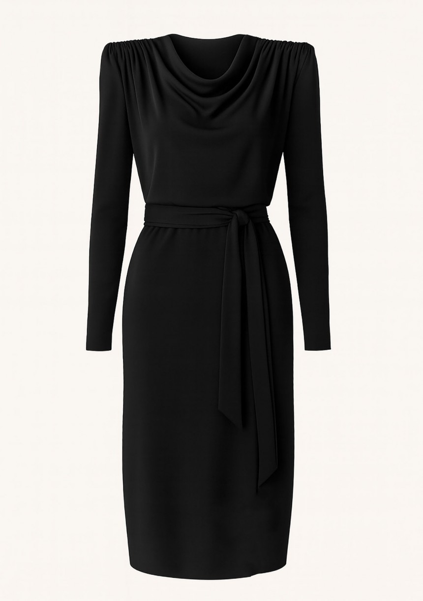 Wszechstronna, czarna sukienka midi z zakrytym, lejącym dekoltem. Kreacja jest wyposażona w pasek, który dodatkowo nadaje elegancki styl.