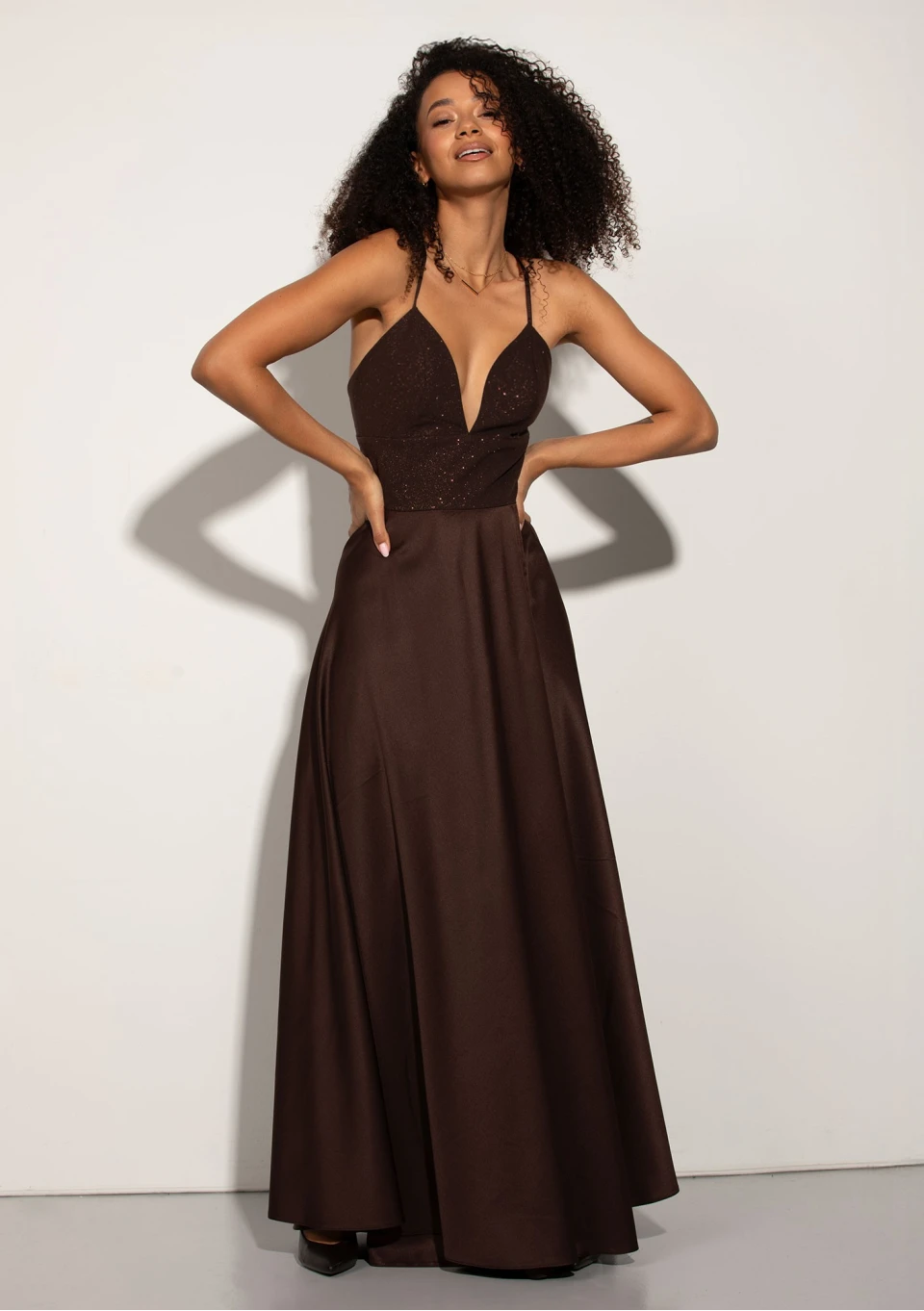 Olśniewająca sukienka brązowa maxi w wieczorowym stylu, z brokatowym dekoltem na subtelnych ramiączkach.