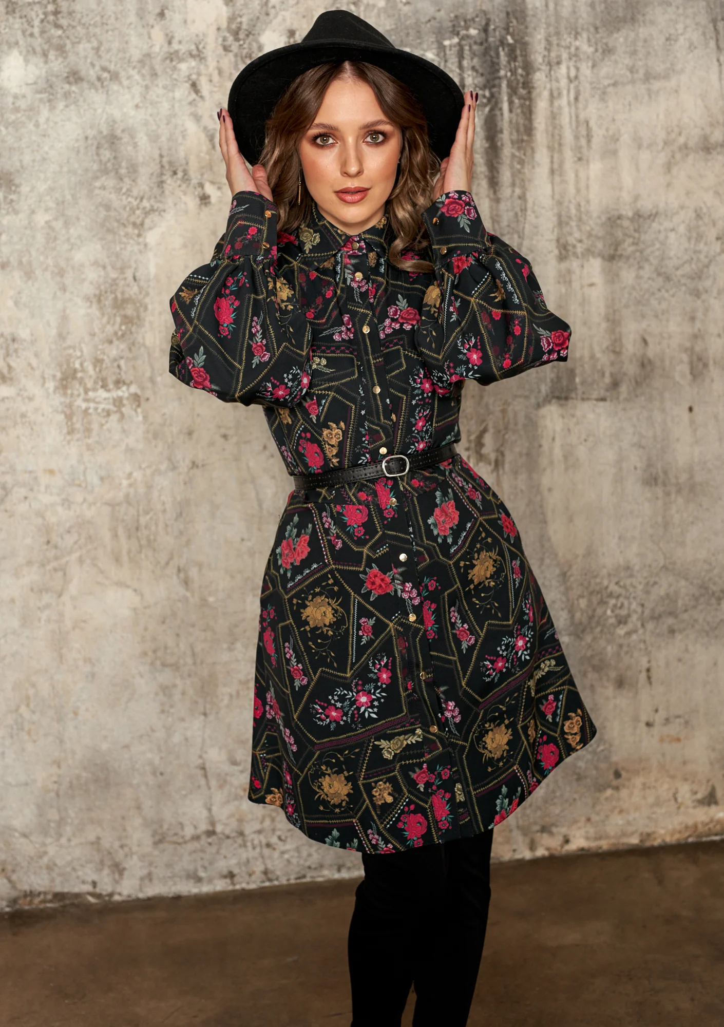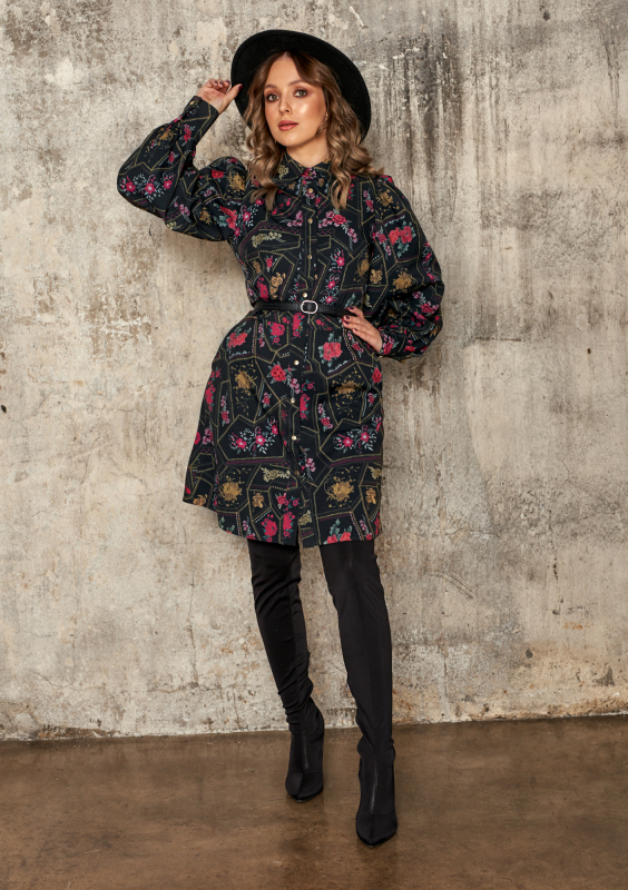 Rozpinana sukienka z kołnierzem w kwiatowy Print