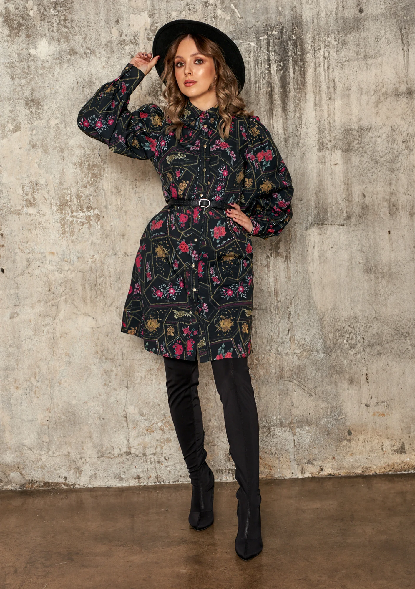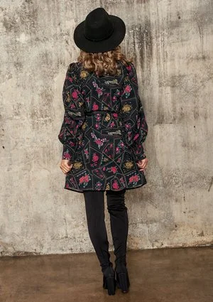 Rozpinana sukienka w kwiatowy print została wykonana z poliestru i laycry. Dzięki temu posłuży Ci w trakcie wielu jesiennych sezonów, ale włożysz ją również w chłodniejsze, wiosenne dni. Nie musisz obawiać się, że ciemna barwa sukienki wyblaknie wskutek regularnego prania. W naszej ofercie znajdziesz model w kwiatowy print w rozmiarach XS, S, M, L, więc z łatwością wybierzesz sukienkę pasującą do swojej sylwetki.