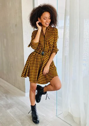 Odważny, musztardowy kolor i kontrastowa, czarna krata to idealne połączenie, które rewelacyjnie sprawdzi się na co dzień - podobnie jak wysokogatunkowy materiał z którego została uszyta sukienka. Prosty, koszulowy krój zyskujesz bardziej nowoczesnego charakteru, dzięki starannie przemyślanym detalom - dekoltowi w kształcie litery V, nowoczesnym klamrom na rękawach oraz paskowi, który sprzedawany jest w komplecie z sukienką. Ten model pokochały gwiazdy kina i telewizji - teraz nadszedł czas na Ciebie!
