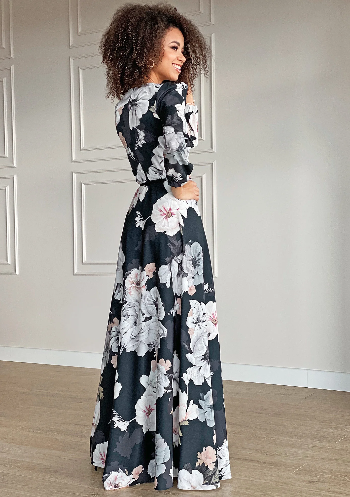 Kwiaty to chyba jeden z najbardziej kobiecych motywów, który świetnie sprawdza się nie tylko na co dzień, ale również podczas różnego rodzaju uroczystości - podobnie jak kopertowa sukienka maxi w czarnym kolorze z nadrukowanymi beżowo-białymi kwiatami. Prezentowany model posiada długie rękawy, kobiecy dekolt w kształcie litery V oraz efektowny rozporek, który pięknie wyeksponuje nogi i optycznie poprawi proporcje sylwetki. Wszystko to sprawia, że sylwetka prezentuje się lekko i kobieco, nawet w przypadku pań o pełniejszych kształtach.
