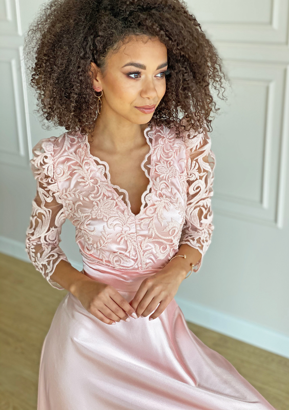 Sukienka maxi z gipiurą Pudrowa