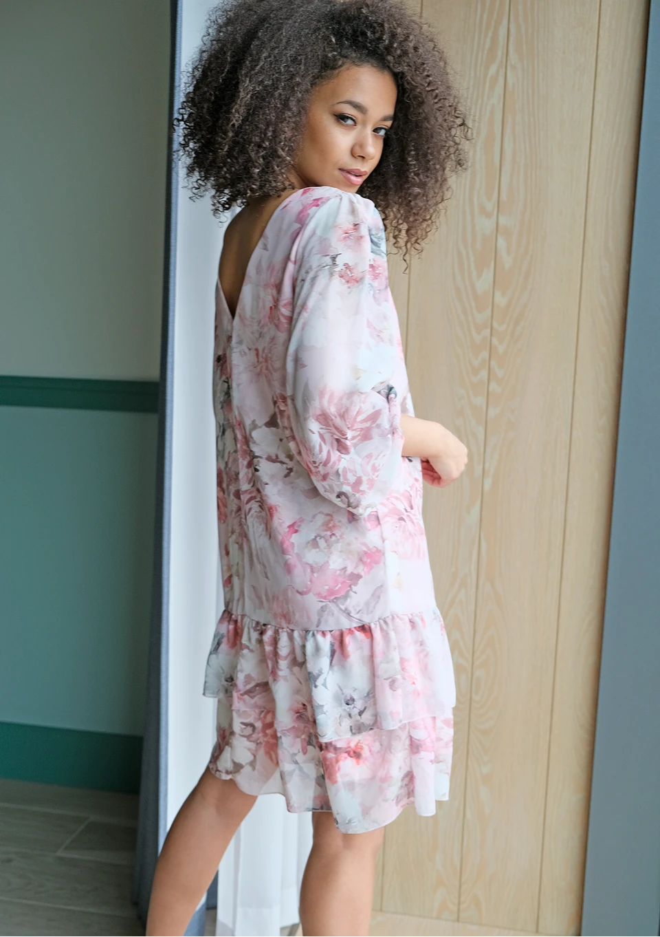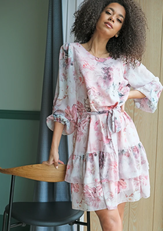 Sukienka z falbaną w kwiaty Chifon Pudrowa F01