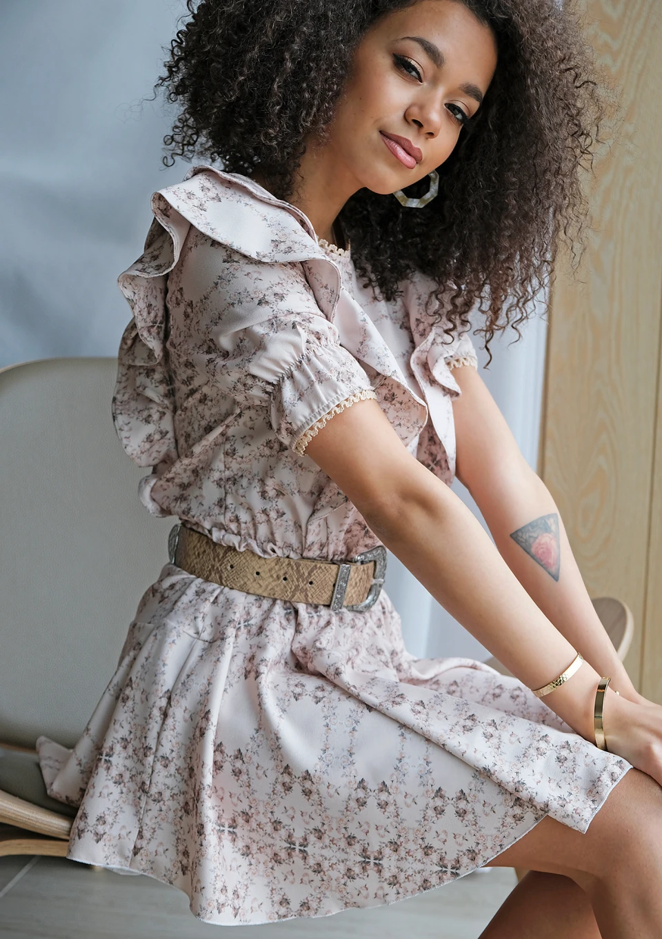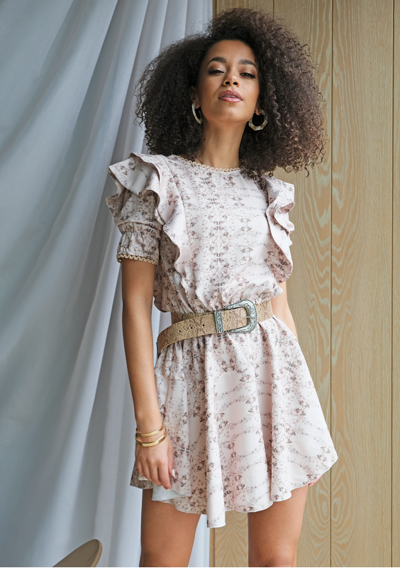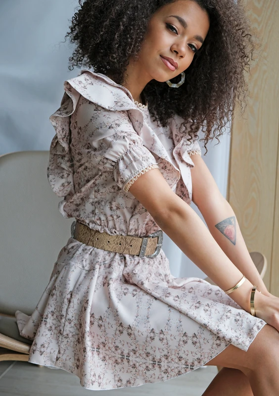 Sukienka mini flowers z falbanami Nude
