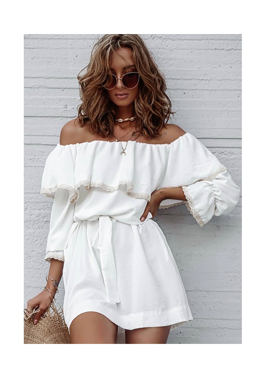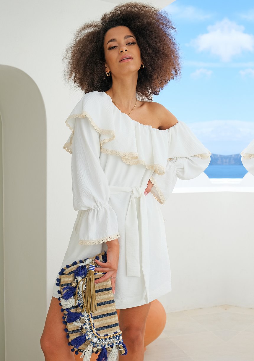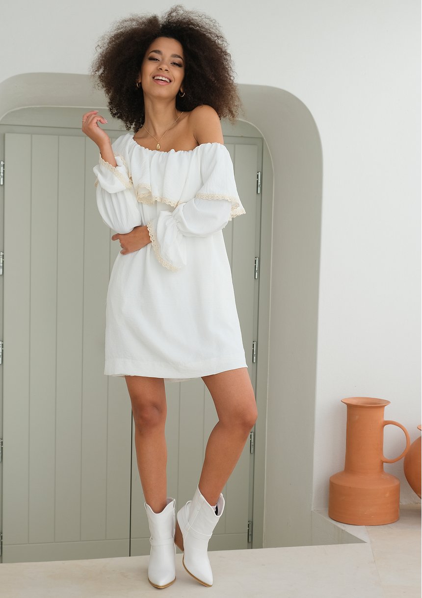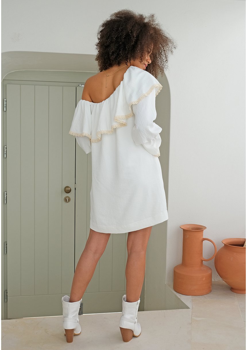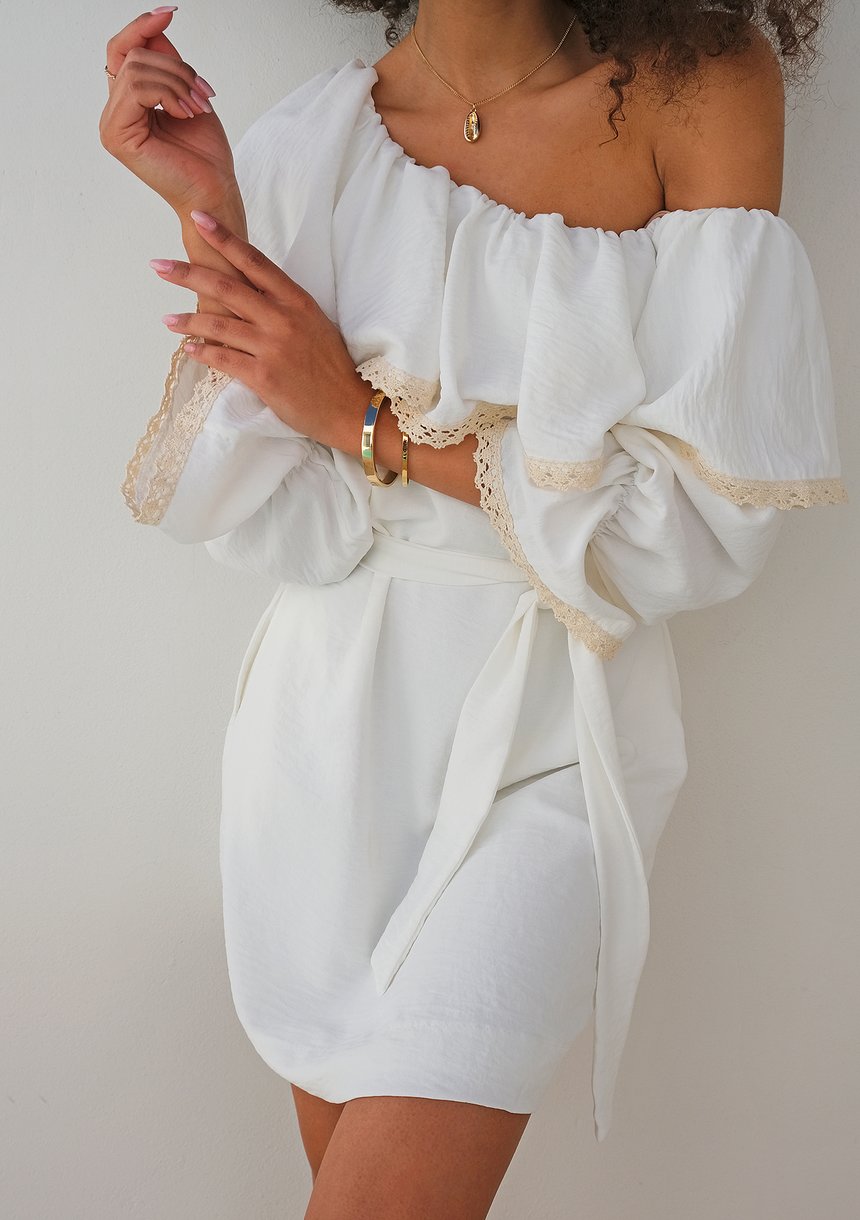 Sukienka z asymetrycznym dekoltem i koronką Ecru