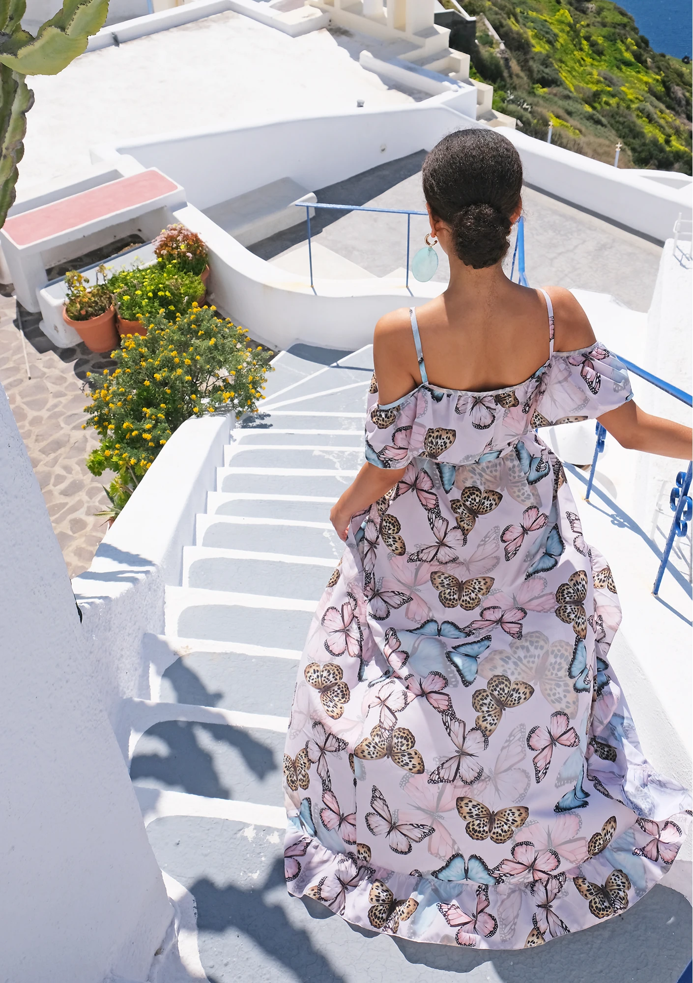 Kreacja ulotna jak zdobiące ją motyle - właśnie taka jest nasza sukienka letnia Butterfly Powder, idealna na wesele lub innego typu przyjęcie organizowane w sezonie wiosenno-letnim. Stylizacja pozwala cieszyć się słońcem i doskonałą pogodą przy zachowaniu idealnego komfortu cieplnego i swobody. Jej tkanina opływa ciało, dając przyjemne uczucie chłodu. Dodatkowo, niezwykle efektownie prezentuje się w trakcie ruchu. Sukienka na lato sięga aż do ziemi, jednak dzięki kopertowemu fasonowi nie krępuje ruchów i w atrakcyjny sposób odsłania długie, opalone nogi. Kreacja posiada subtelny dekolt w serek oraz falbanki, które delikatnie okrywają ramiona. Motyw falban powtarza się również na wykończeniu całej spódnicy, co spaja stylistykę sukni i podkreśla jej zwiewny charakter.
