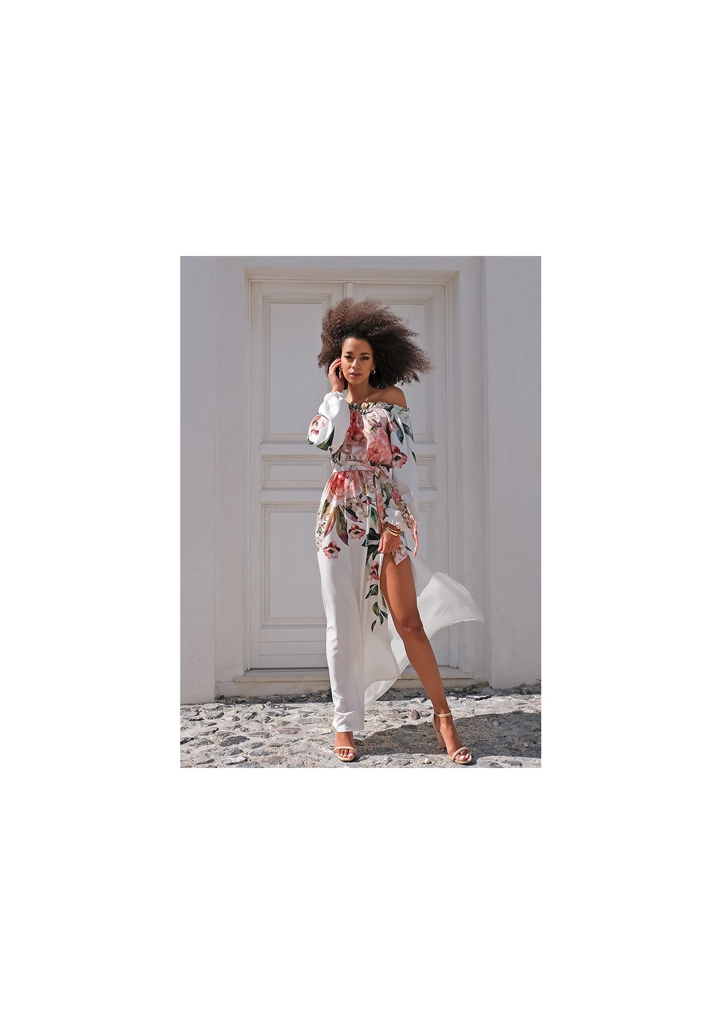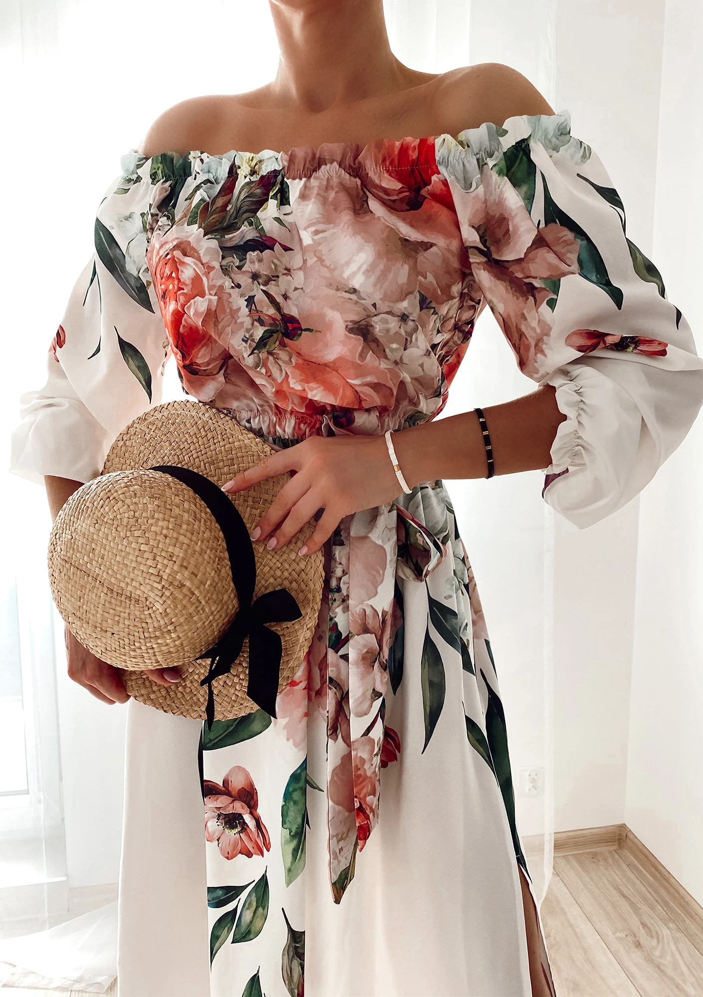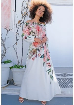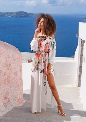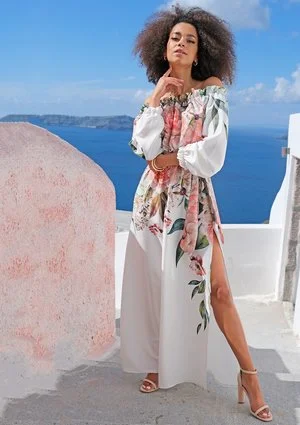 Prezentowany model sukienki na lato to efekt projektu Alicji Komar oraz profesjonalnej pracy polskich zakładów krawieckich. Kreację uszyto z wysokiej jakości, zwiewnej tkaniny udekorowanej przepięknym kwiatowym borderem. Suknia jest jasna, lecz jej biel przełamano pastelowo-różowym motywem kwiatów i świeżych, zielonych liści. Stylizacja jest jednocześnie swobodna i dobrze dopasowana do sylwetki. Efektownie podkreśla jej atuty, czyli smukłą talię i długie nogi. Pomimo długich rękawków i długości maxi pozwala czuć się wygodnie i zachowywać pełen komfort cieplny. Wszystko to za sprawą połączenia lekkiej tkaniny, luźnego fasonu i jasnej kolorystyki. Sukienka na lato spełni się w roli wielu różnych stylizacji - zarówno tych bardziej codziennych, jak i odświętnych. Efektownie podkreśli letnią opaleniznę i wydłuży optycznie całą sylwetkę. Suknia tego typu to gwarancja, że zaprezentujemy się doskonale i zwrócimy na siebie uwagę wszystkich obserwatorów.