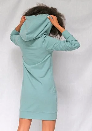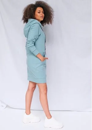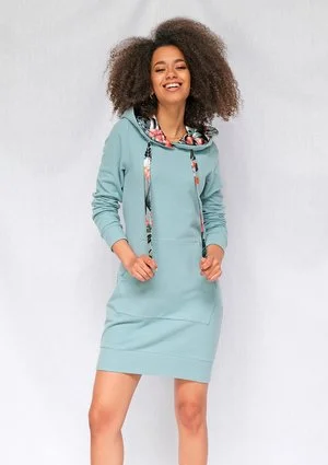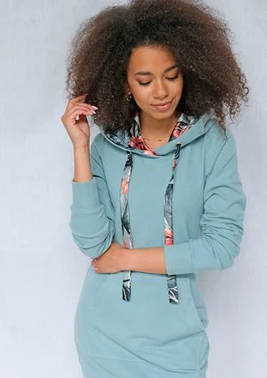 Wybór sukienek na lato jest naprawdę spory, ale w tym czasie warto zdecydować się na sukienkę dresową z kapturem o ponadczasowym fasonie oraz kolorze. Proponowany model składa się w 95% z bawełny oraz w 5% z elastanu. Dzięki temu jest oddychający, przyjemny w dotyku i przede wszystkim nie traci swojego kształtu nawet po wielu praniach. Warto wziąć go pod uwagę, szykując letnie zakupy. Dodatkowo uwagę przyciąga sama kolorystyka. Sukienka ma szarawy odcień, który nasuwa na myśl popielatą paletę barw. Sięga długością przed kolana i posiada długie rękawy, które z łatwością można podwinąć. Na pewno elementem, który najbardziej przyciąga wzrok, są kolorowe wstawki na kapturze oraz troczkach sukienki. Wzór Exotic Leaves jest bardzo świeży, a jednocześnie ponadczasowy.