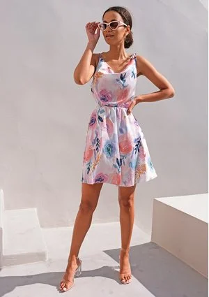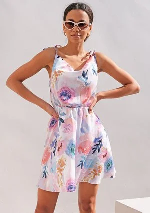 Fason mini, z wiązanymi ramiączkami i dekoltem typu woda. Sukienka posiada elastyczną gumkę w talii.