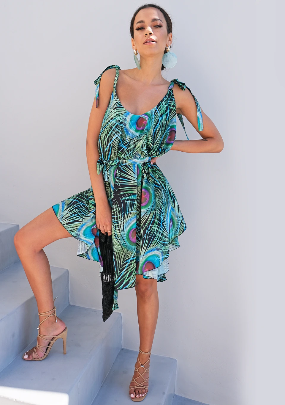 Alexa - Letnia sukienka mini na ramiączkach w kwiatki Ecru