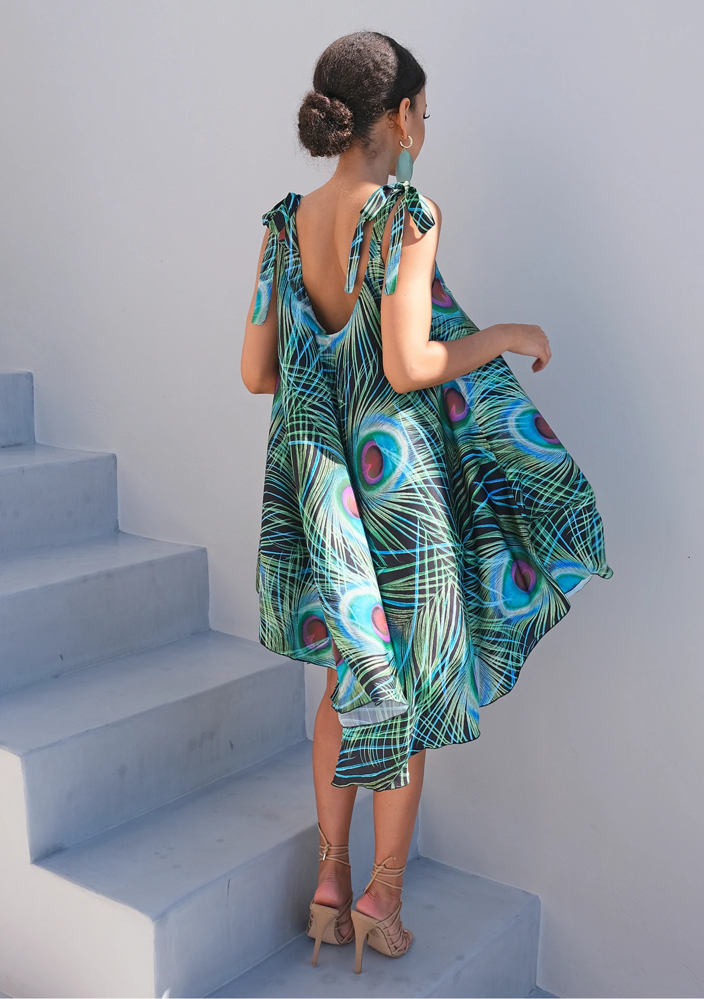 Sukienka wiązana na ramionach z satyny Pawie Pióra