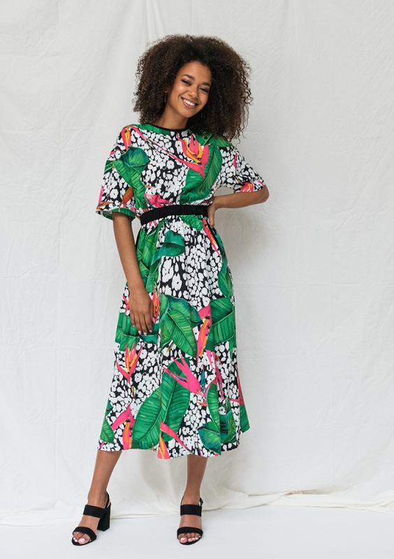 Grace - Rozkloszowana sukienka midi z modelującymi przeszyciami Brązowa