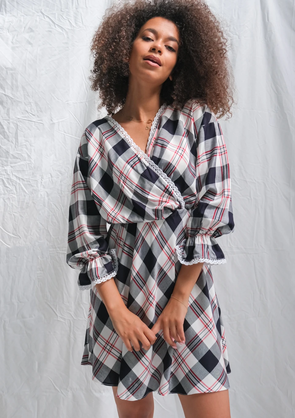 Sukienka w kratę z koronką granatowa