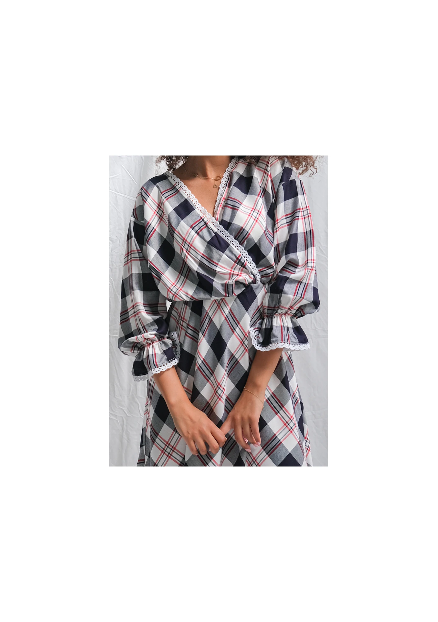 Nietuzinkowa sukienka damska w kratkę jest wykonana z przyjemnej w dotyku wiskozy. Materiał zapewnia optymalny dopływ powietrza do skóry, co przekłada się na podwyższony komfort użytkowania. Kopertowy dekolt i wyraźne odcięcie w pasie sprawiają, że sukienka mini doskonale podkreśla nie tylko nogi, ale też biust i talię. Luźny fason pozwala jednak skrzętnie tuszować ewentualne mankamenty figury. Szerokie rękawy mają optymalną długość ¾. Pięknie prezentują się z ozdobnym ściągaczem. Zarówno rękawy, jak i zakładki przy dekolcie sukienki są estetycznie wykończone drobną koronką. Daje to estetyczny, dziewczęcy efekt. Damska sukienka w kratę jest propozycją na codzienną stylizację. Można nosić do niej obuwie sportowe, w tym trampki, sneakersy, a nawet glany. Połączona z butami na obcasie lub stylowymi półbutami nabiera bardziej wyjściowego charakteru. Nadaje się na kameralne uroczystości rodzinne, randki i spotkania w gronie znajomych. Neutralna kolorystyka, czyli biało-granatowa kratka z czerwonymi detalami pasuje do dodatków o wielu odcieniach. Można ożywić ją czerwonymi akcesoriami lub utrzymać zachowawczą tonację. Stylowa sukienka damska w kratę nadaje się do noszenia w słoneczne dni wiosenne, letnie i jesienne. Model został zaprojektowany i uszyty w Polsce, więc wybierając go, wspierasz rodzimą gospodarkę.