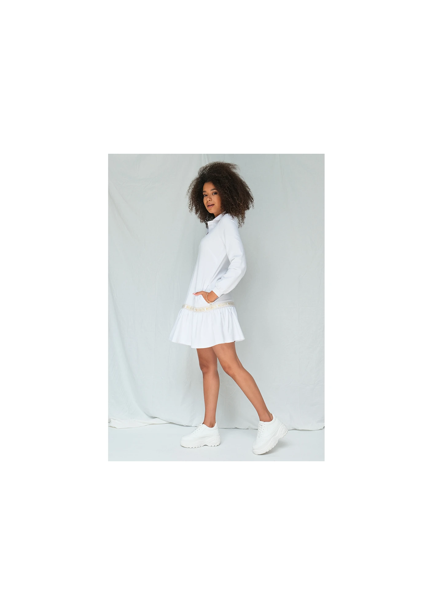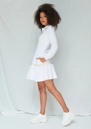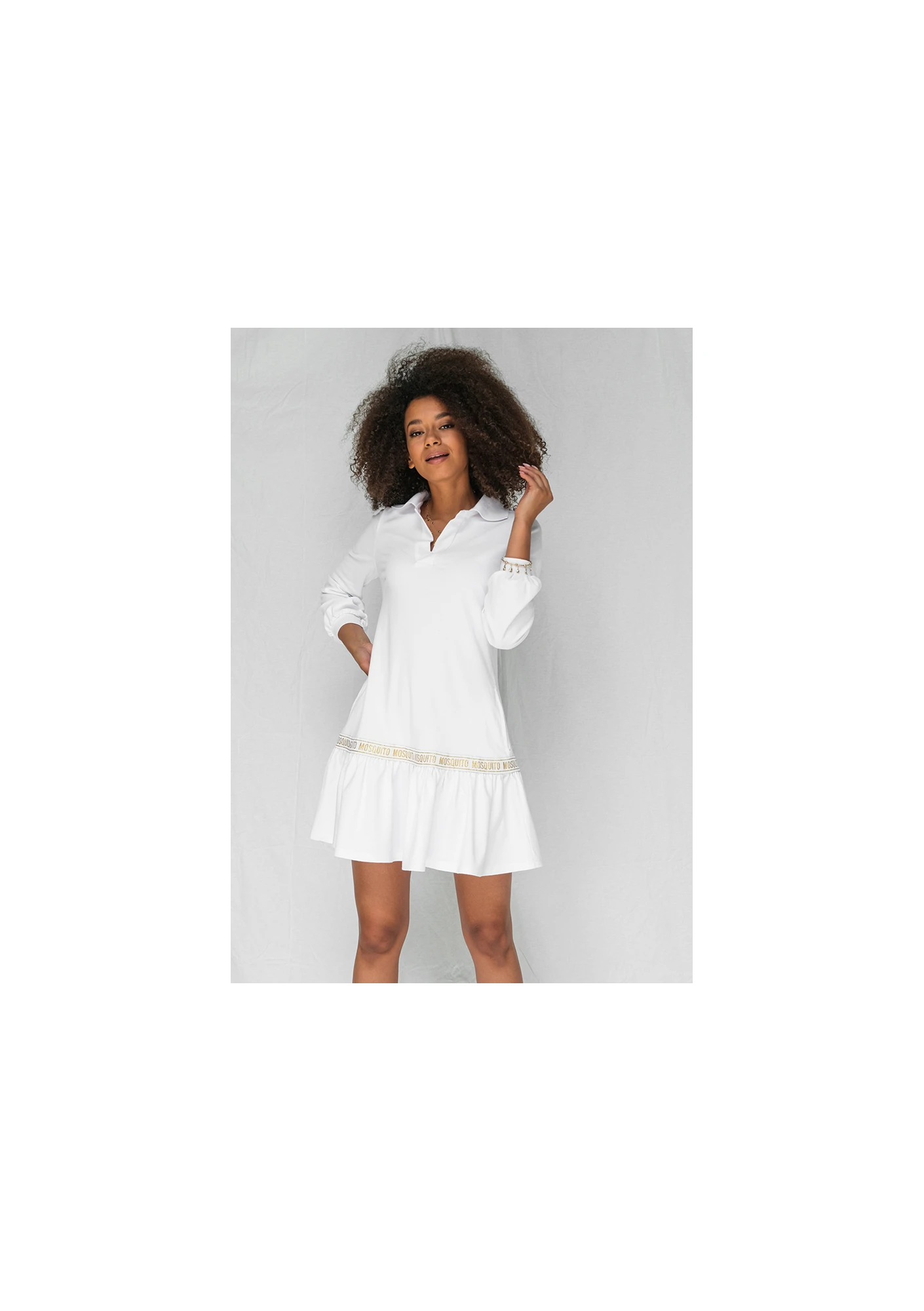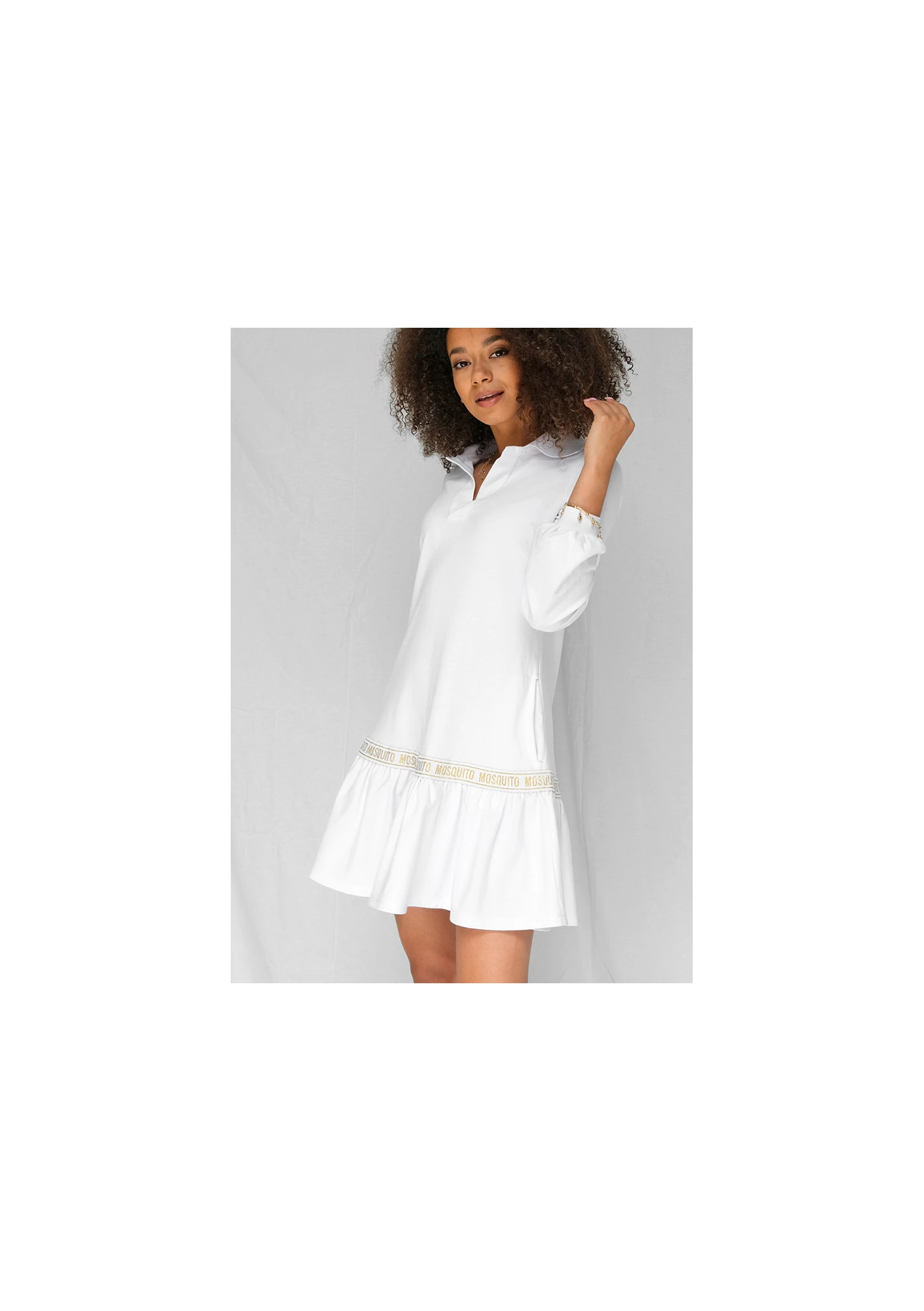Załóż sukienkę nie rezygnując z wygody! Bawełniany model od Mosquito zapewnia maksymalną swobodę i jednocześnie dba o stylowy wygląd. Biała sukienka damska tworzona jest w unikatowym, sportowym designie. Góra modelu przypomina długą tunikę - luźne, bufiaste rękawy można podwijać, a brak wcięcia w talii wysmukla sylwetkę. Dekolt wykończony jest szerokim kołnierzem, który dodaje sukience sportowego wyglądu. W sukience nie brakuje również wyjątkowo kobiecych akcentów. To między innymi spódnica wykończona falbanami, kończąca się nad kolanem. Odcięcie pomiędzy tuniką a spódnicą tworzy złota wstawka z napisem MOSQUITO, dodająca odzieży stylowego charakteru. Sukienka dostępna jest w sklepie w rozmiarach XS - L.