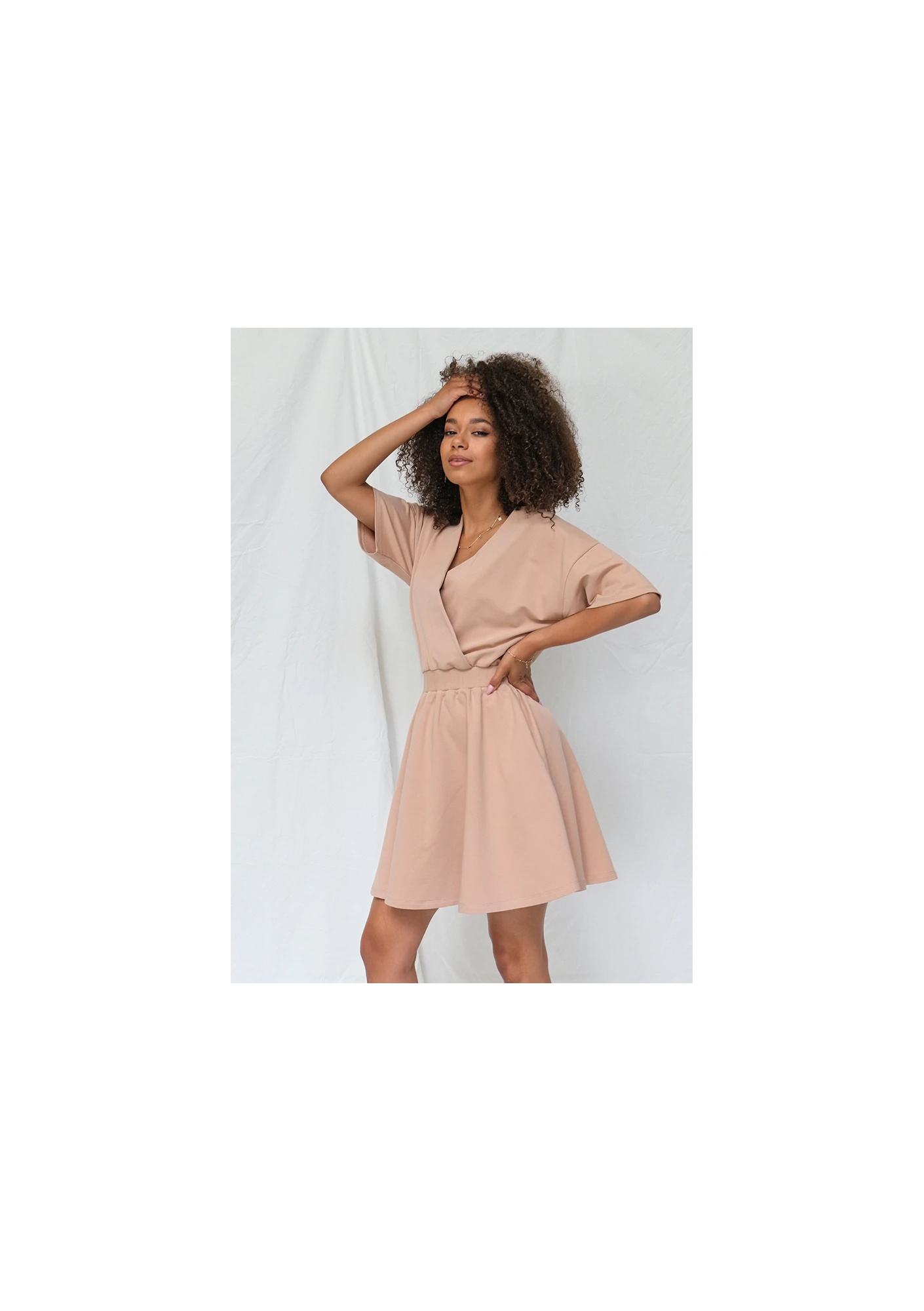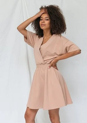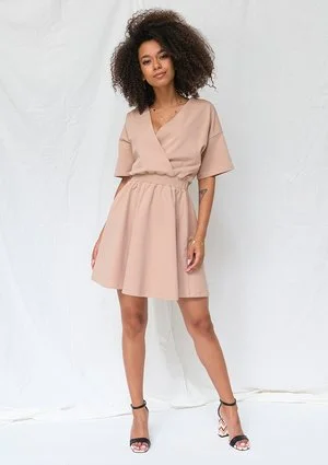 Modna sukienka damska z jerseyu sprawdzi się w Twojej szafie, jako uniwersalne ubranie! Z odpowiednimi dodatkami możesz wybrać ją do pracy, na rodzinne spotkanie, a nawet wesele lub studniówkę! Krój oparty jest na klasycznej konstrukcji koktajlowej. Górna część sukienki została przygotowana w stylu charakterystycznej koperty, subtelnie podkreślając dekolt i biust. Szerokie rękawy do łokci rozszerzane są ku dołowi, a dzięki specjalnie przygotowanym szwom, nie ograniczają swobody ruchów. Brązowoszara sukienka na wesele przełamana jest w talii elastyczną gumą. Odpowiednio przyszyta do niej spódnica tworzy romantyczne fale, opadające wzdłuż sylwetki. Sukienka sięga nad kolano. Ładnie układa się w czasie chodzenia, czy tańca. Miękki materiał nie ociera delikatnej skóry, a szwy nie pozostawiają na niej odcisków.
