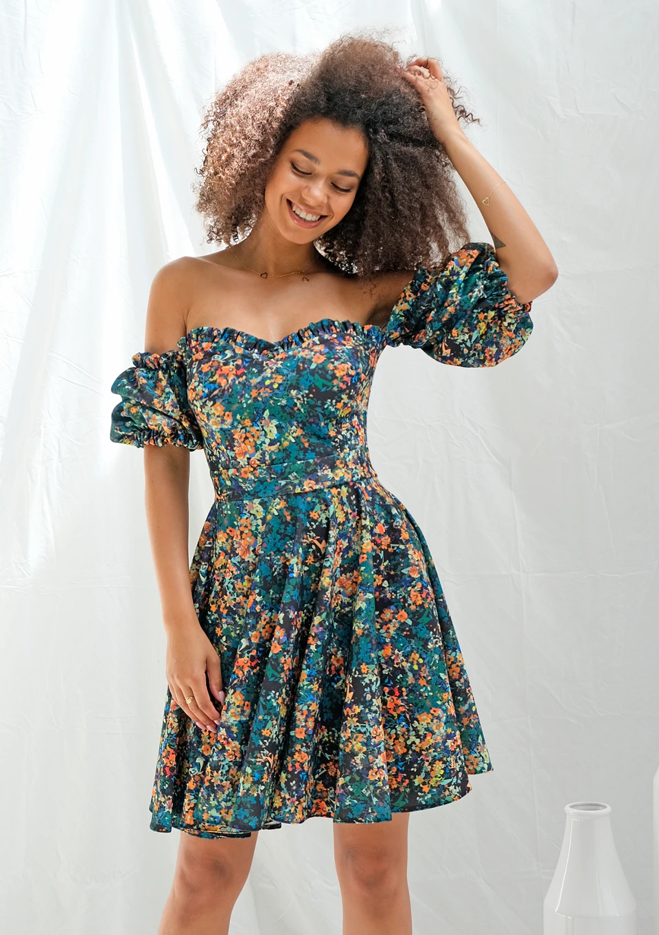 Koktajlowa sukienka o rozkloszowanym fasonie z gorsetową górą. Wzór drobnej łączki i osunięte poniżej ramion rękawki nadają jej romantycznego stylu.