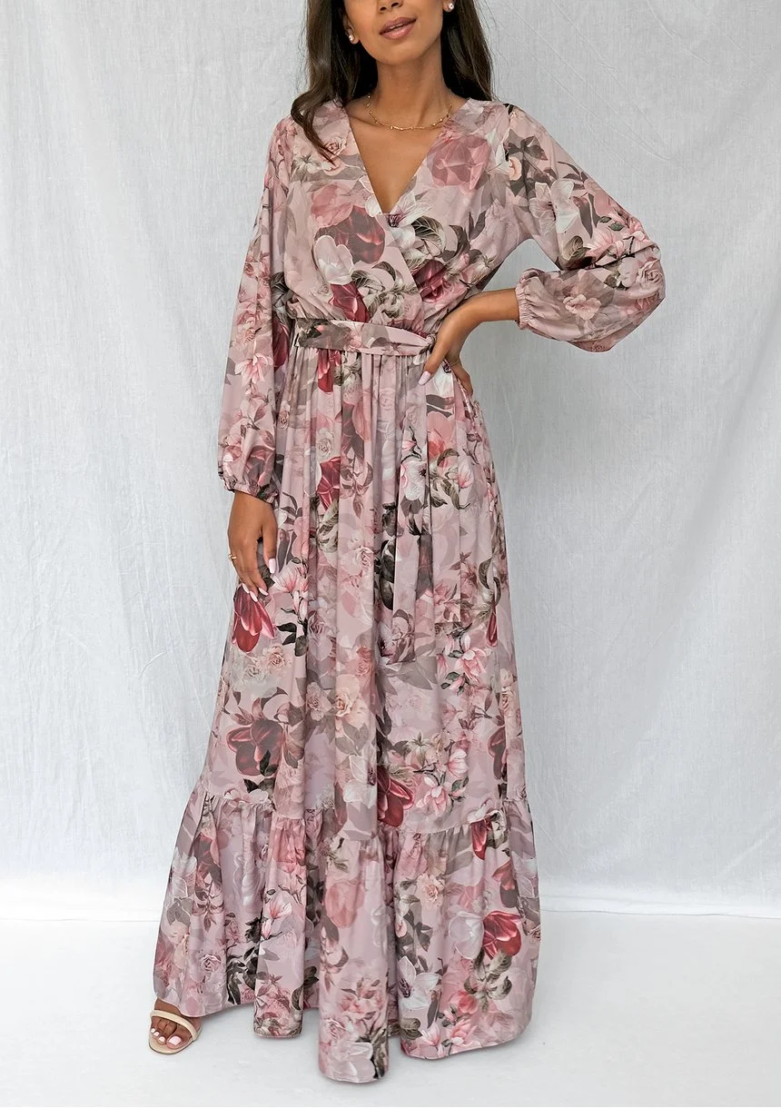 Wiązanie w talii dodaje gracji i podkreśla kształt sylwetki. Kopertowy fason pięknie uwypukla dekolt. Sukienka ma luźne rękawy zakończone ściągaczami. Całość daje wrażenie lekkości i zwiewności. Jeżeli lubisz kwieciste motywy i kobiece kolory, ta sukienka jest dla Ciebie. Warto dobrać do niej dobrze korespondujące dodatki na przykład w odcieniu nude.