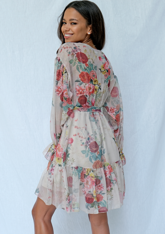 Olivia to beżowa sukienka ze zwiewnego szyfonu z wielobarwnym deseniem kwiatów. Jest nieco uwodzicielska, dzięki półprzezroczystej tkaninie kopertowego dekoltu, a zarazem eteryczna i subtelna w swej lekkiej formie.