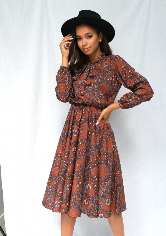Brązowa sukienka jesienna midi, zaprojektowana w bardzo uniwersalnym stylu. Dopracowana w każdym szczególe, zachwyca geometryczną kompozycją wzoru, elegancko wiązanym kołnierzykiem i lekkością formy. Doskonale pasuje na proste, codzienne okazje.