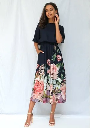 Greta - Sukienka midi z kwiatowym borderem Granatowa