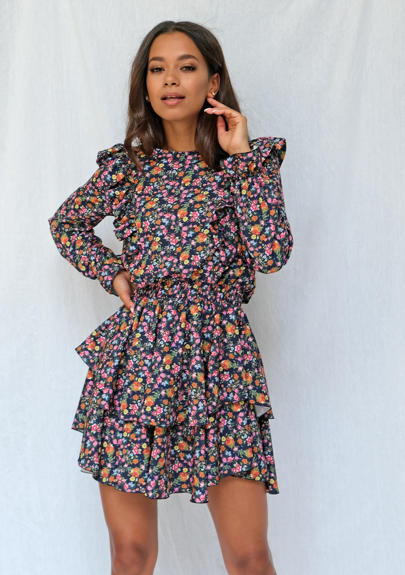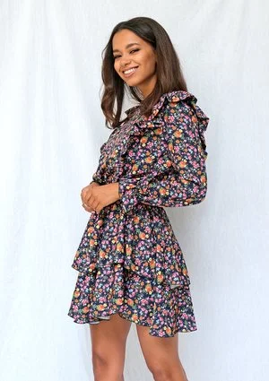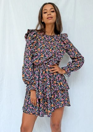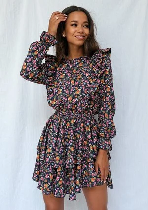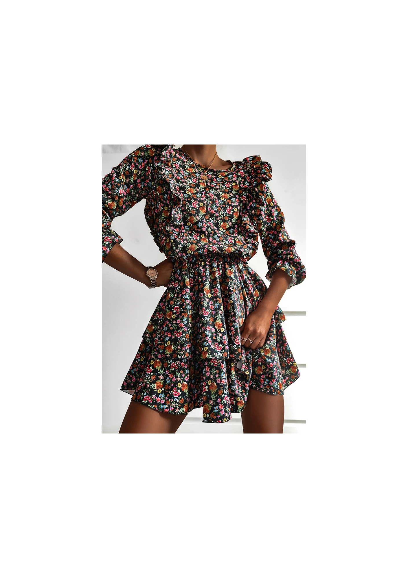 Fason mini, rozkloszowany, z gumką w talii, długimi rękawami, falbankami przy dekolcie.